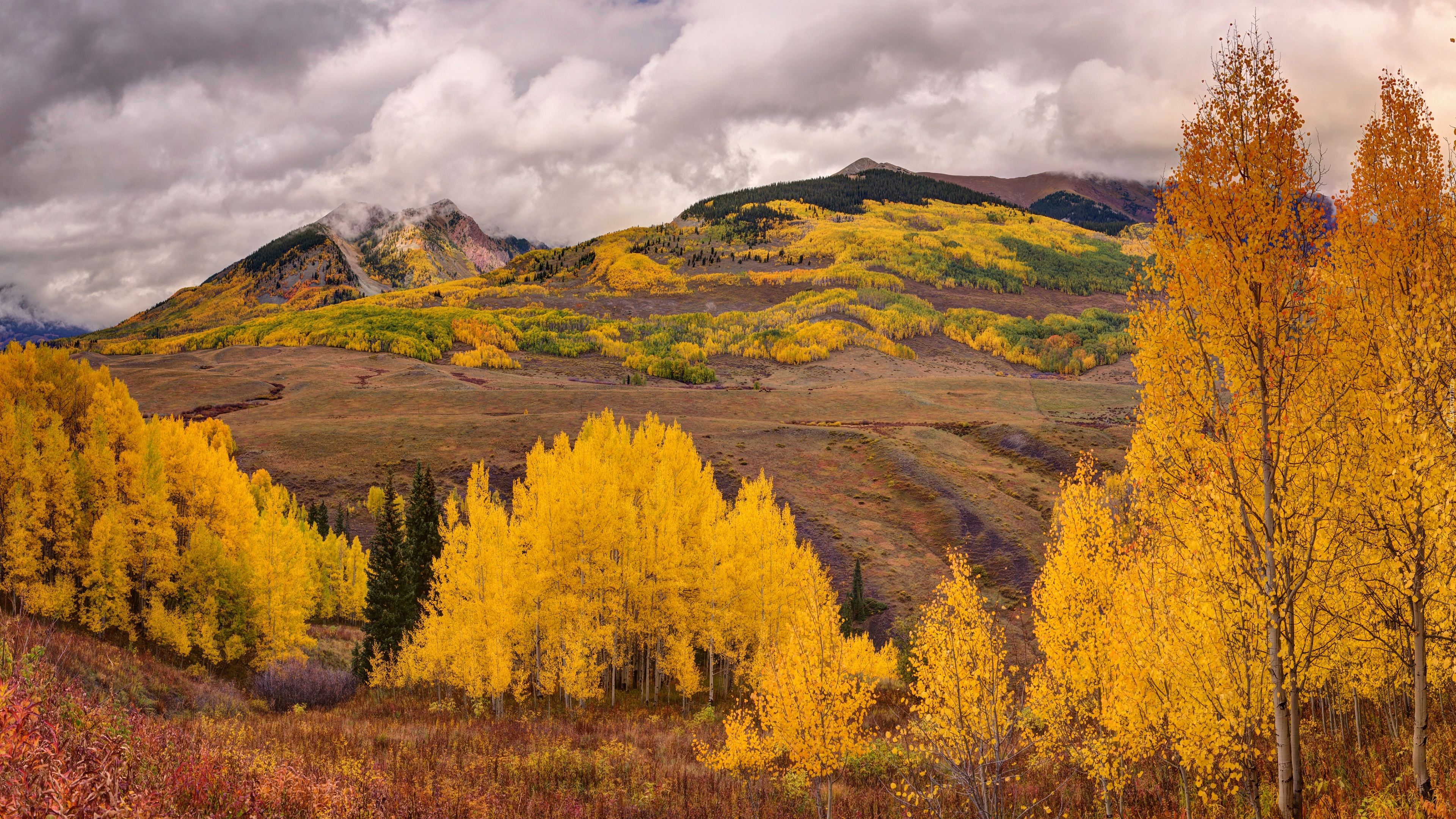 Edytor tapety: Jesienne drzewa na wzgórzach na tle gór