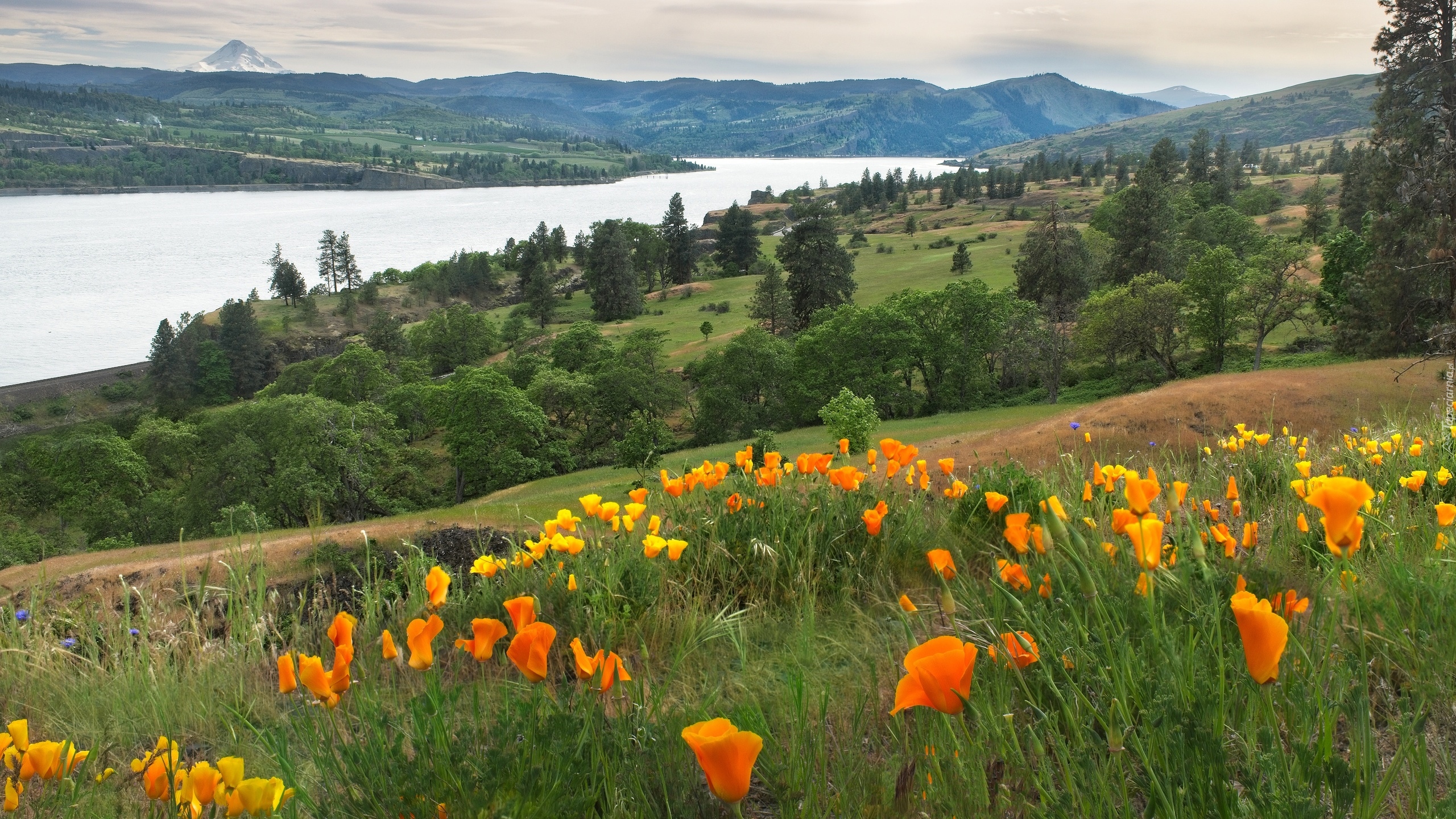 Edytor tapety: Maczki kalifornijskie na wzgórzu nad rzeką