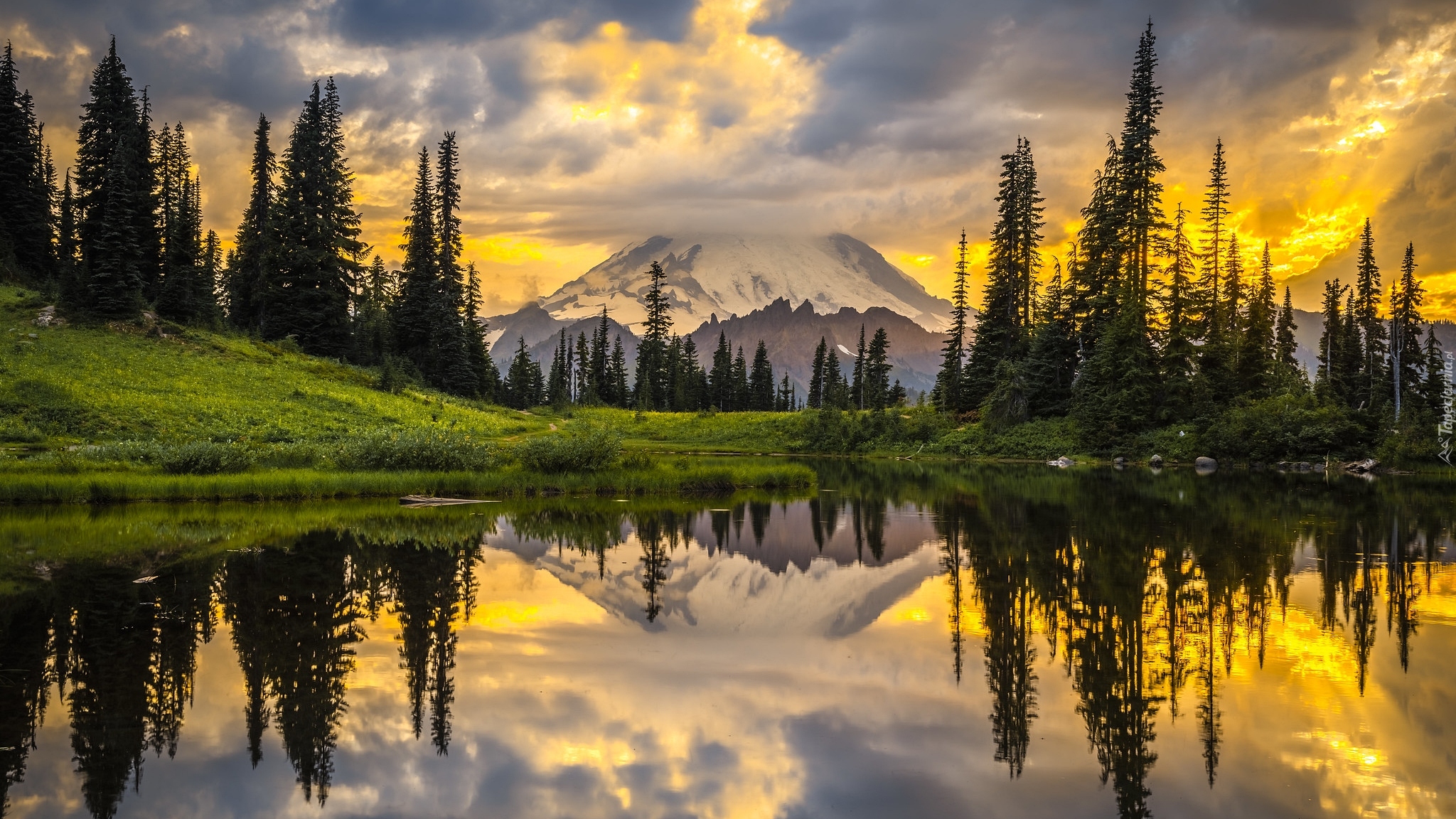 Edytor tapety: Odbicie stratowulkanu Mount Rainier w jeziorze Tipsoo