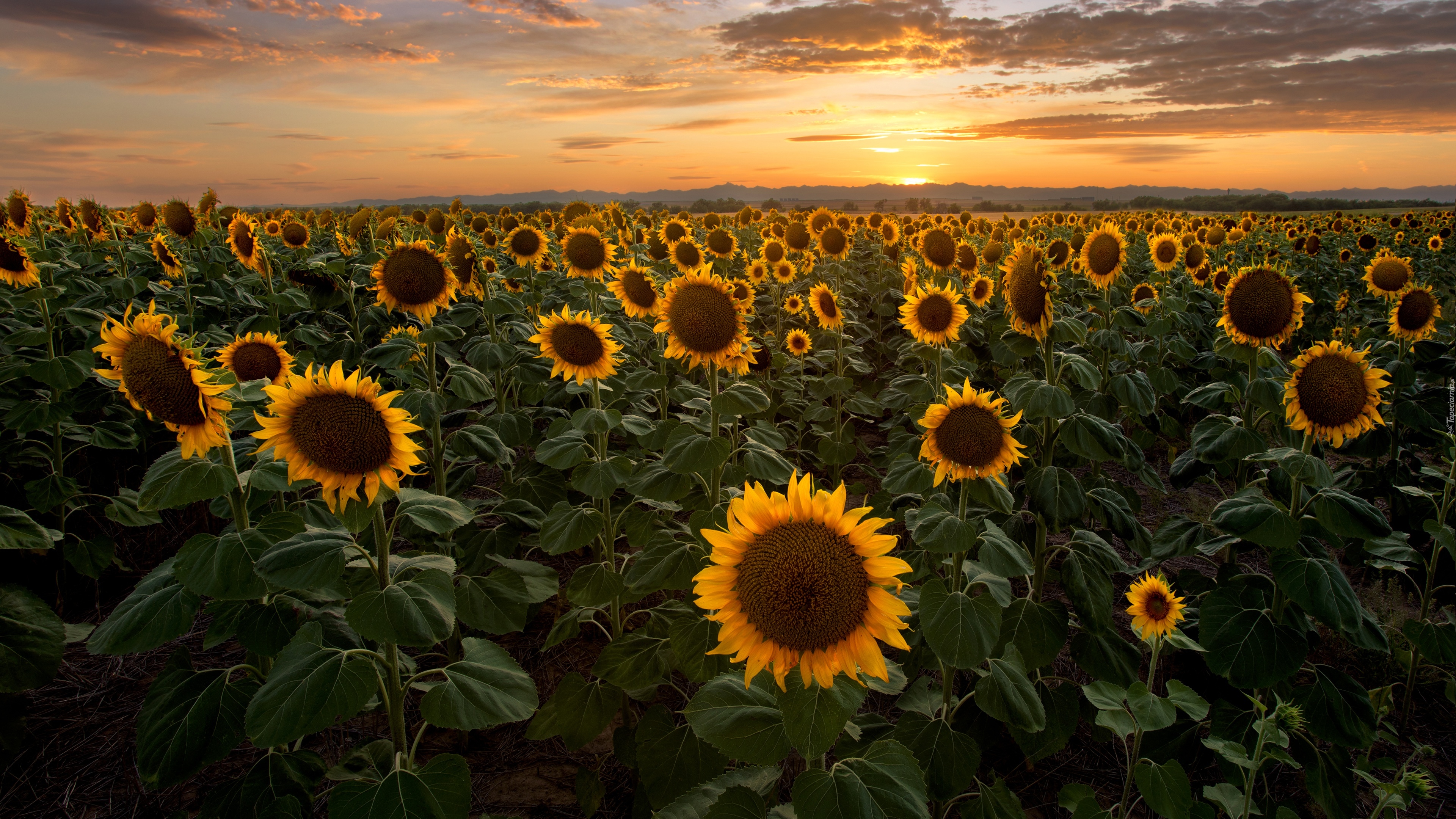 Edytor tapety: Słoneczniki na polu o zmierzchu