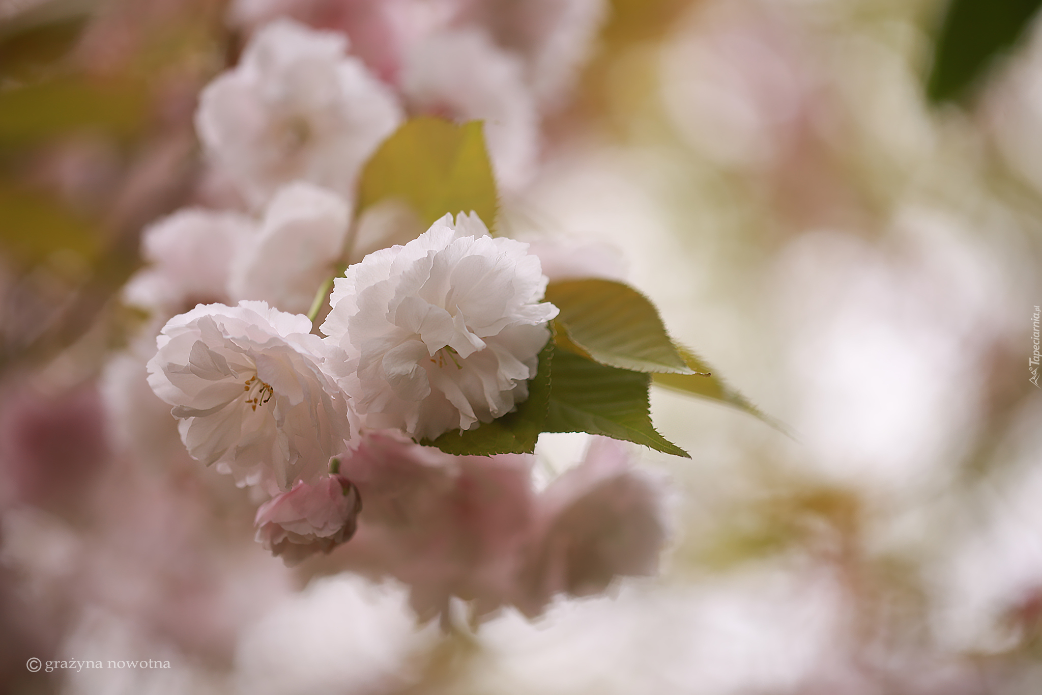 Edytor tapety: Gałązka z kwiatami wiśni japońskiej na rozmytym tle