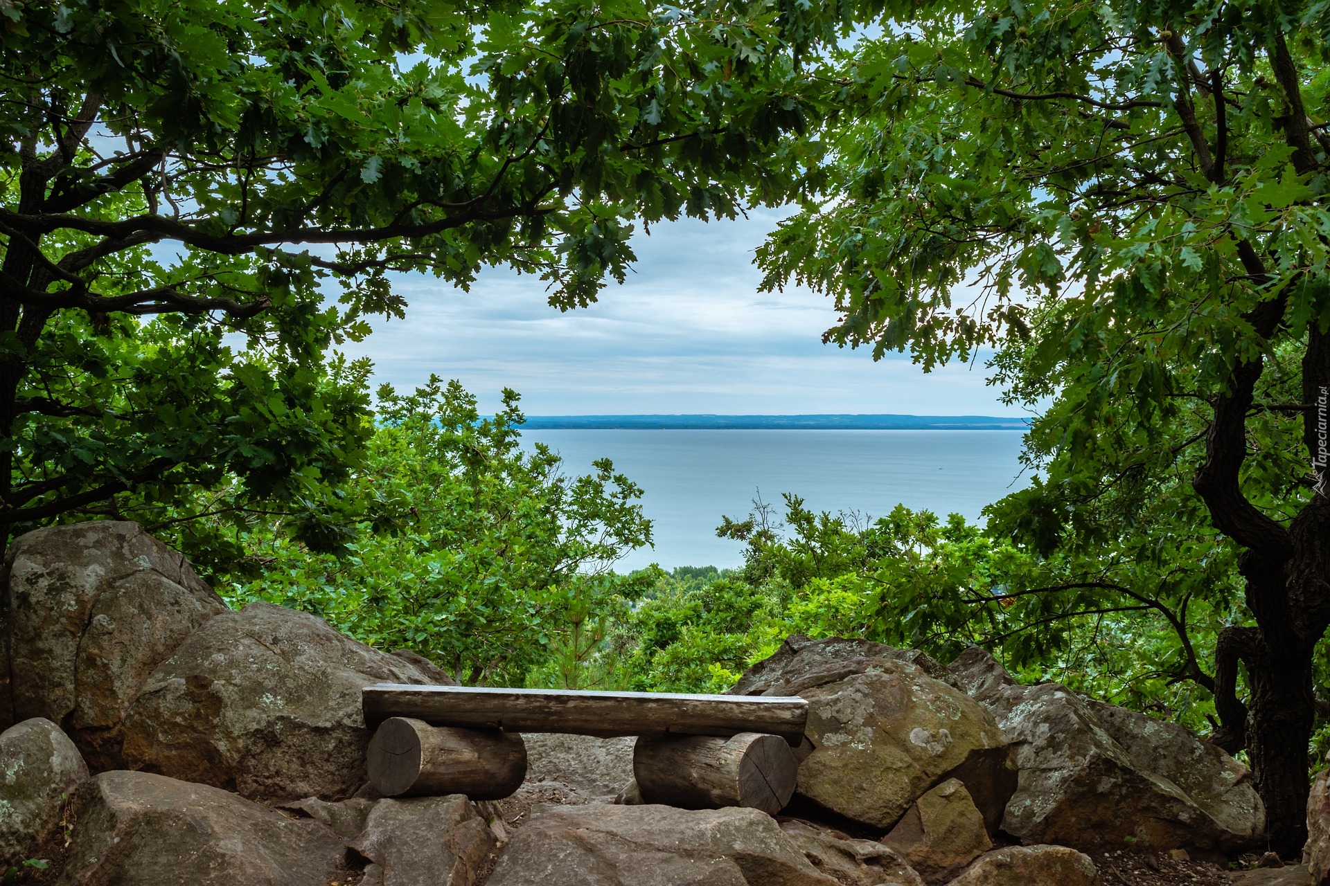 Edytor tapety: Widok zza drzew na jezioro Balaton