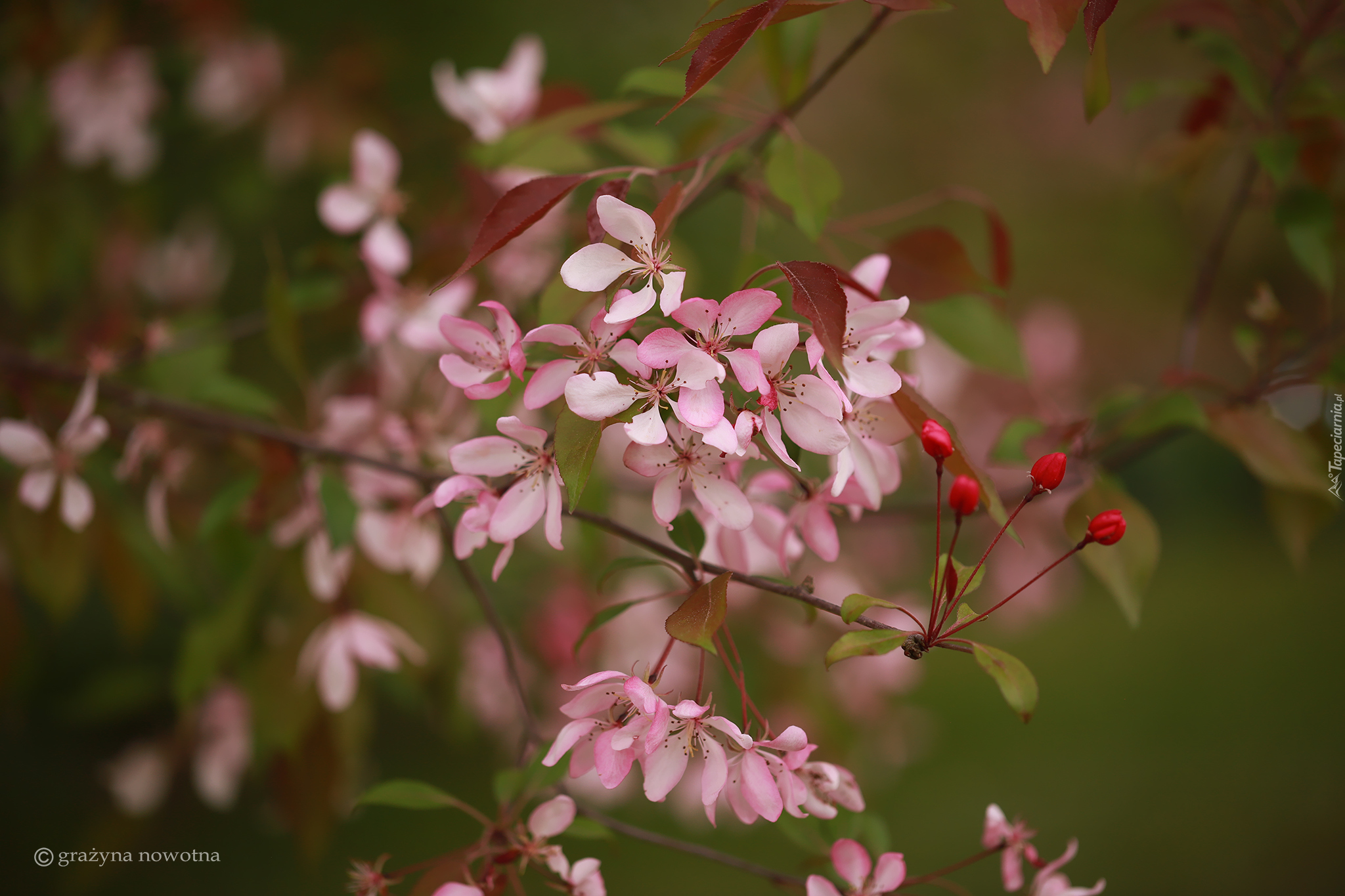 Edytor tapety: Kwiaty i pąki drzewa owocowego na gałązce