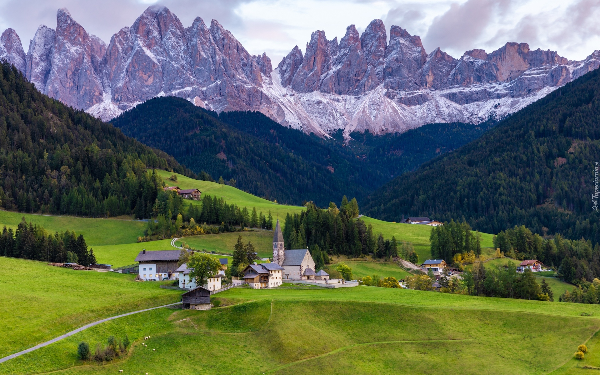 Edytor tapety: Domki i kościół we wsi Santa Maddalena