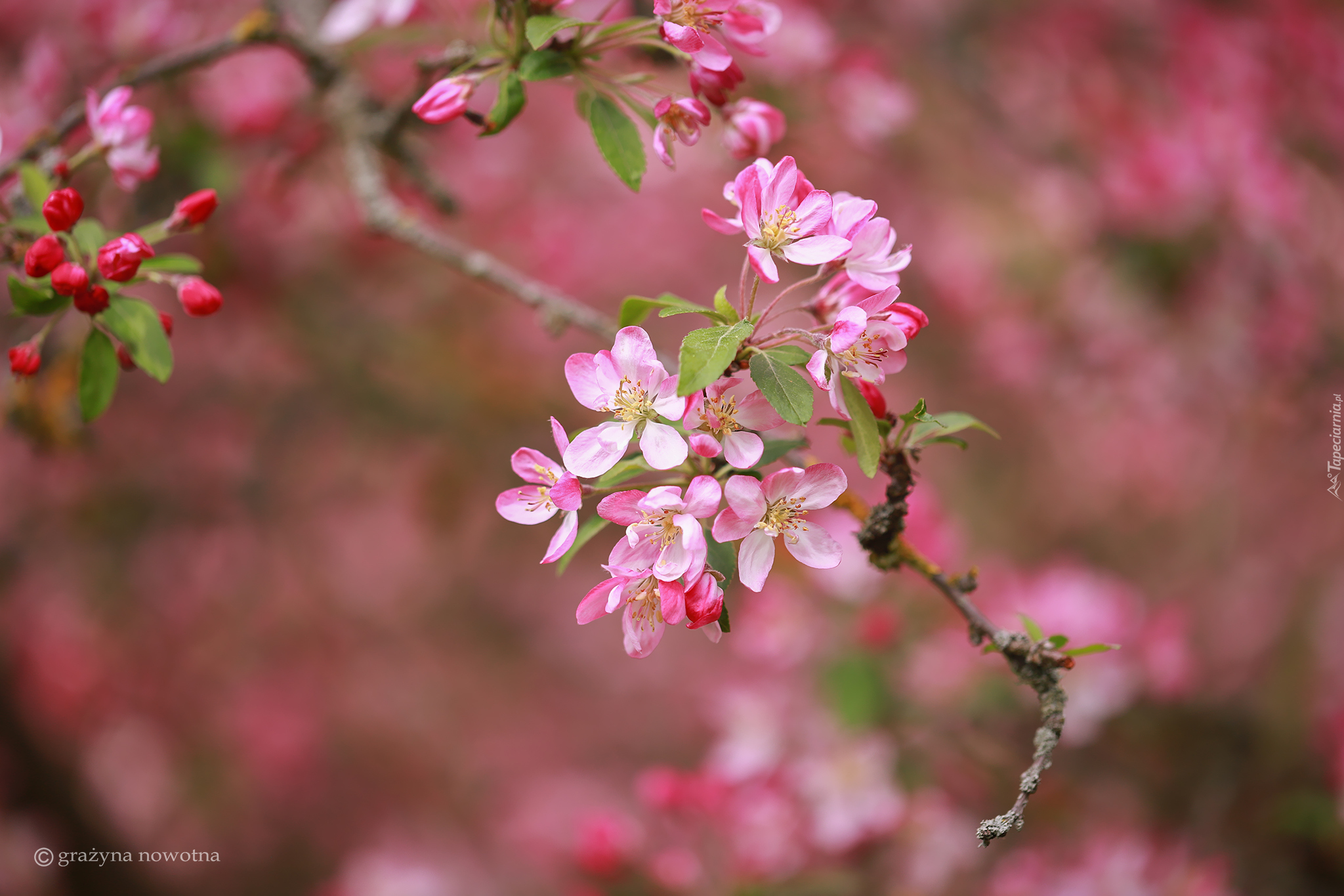 Edytor tapety: Różowe kwiaty i liście na gałązce drzewa owocowego