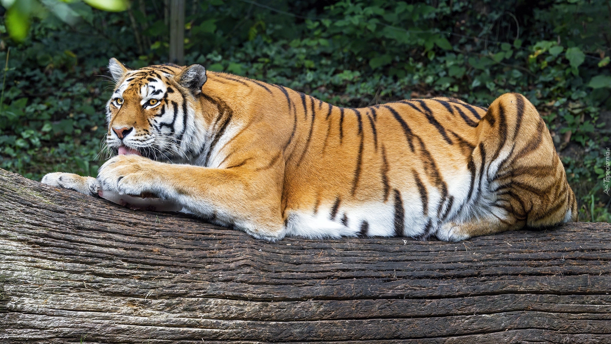 Edytor tapety: Tygrys leżący na kłodzie i liżący łapę