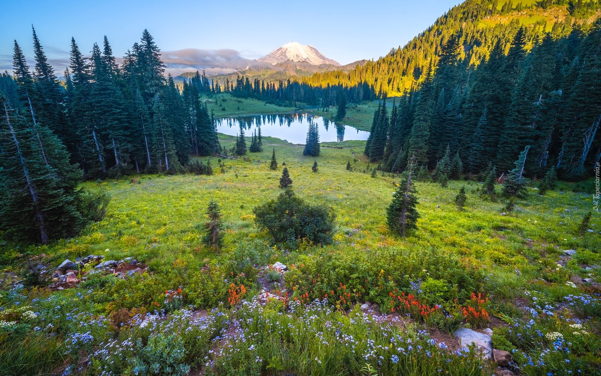 Edytor tapety: Łąka i drzewa na tle jeziora Tipsoo Lake