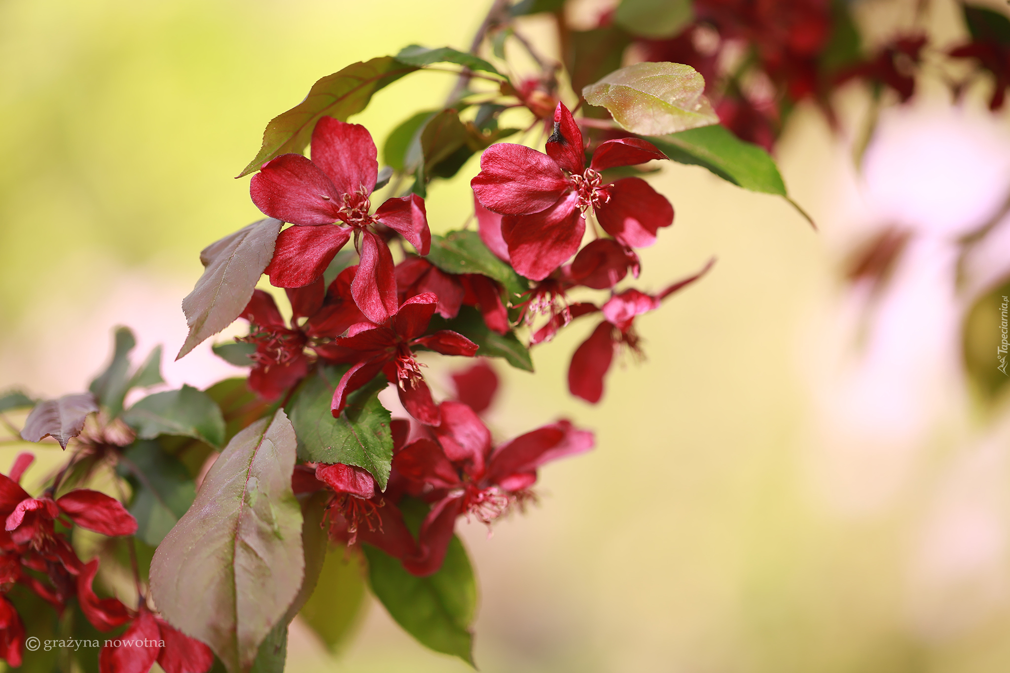Edytor tapety: Czerwone kwiaty i liście na gałązce jabłoni