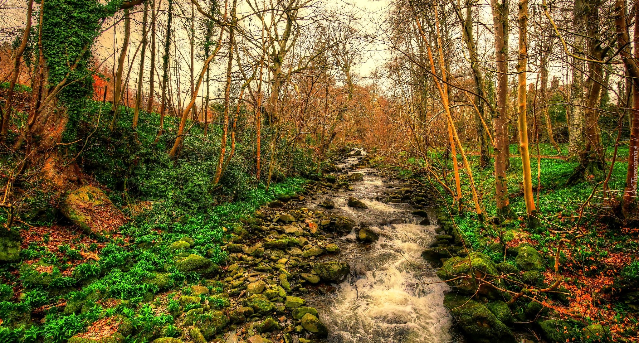 Edytor tapety: Bezlistne drzewa przy leśnym strumieniu