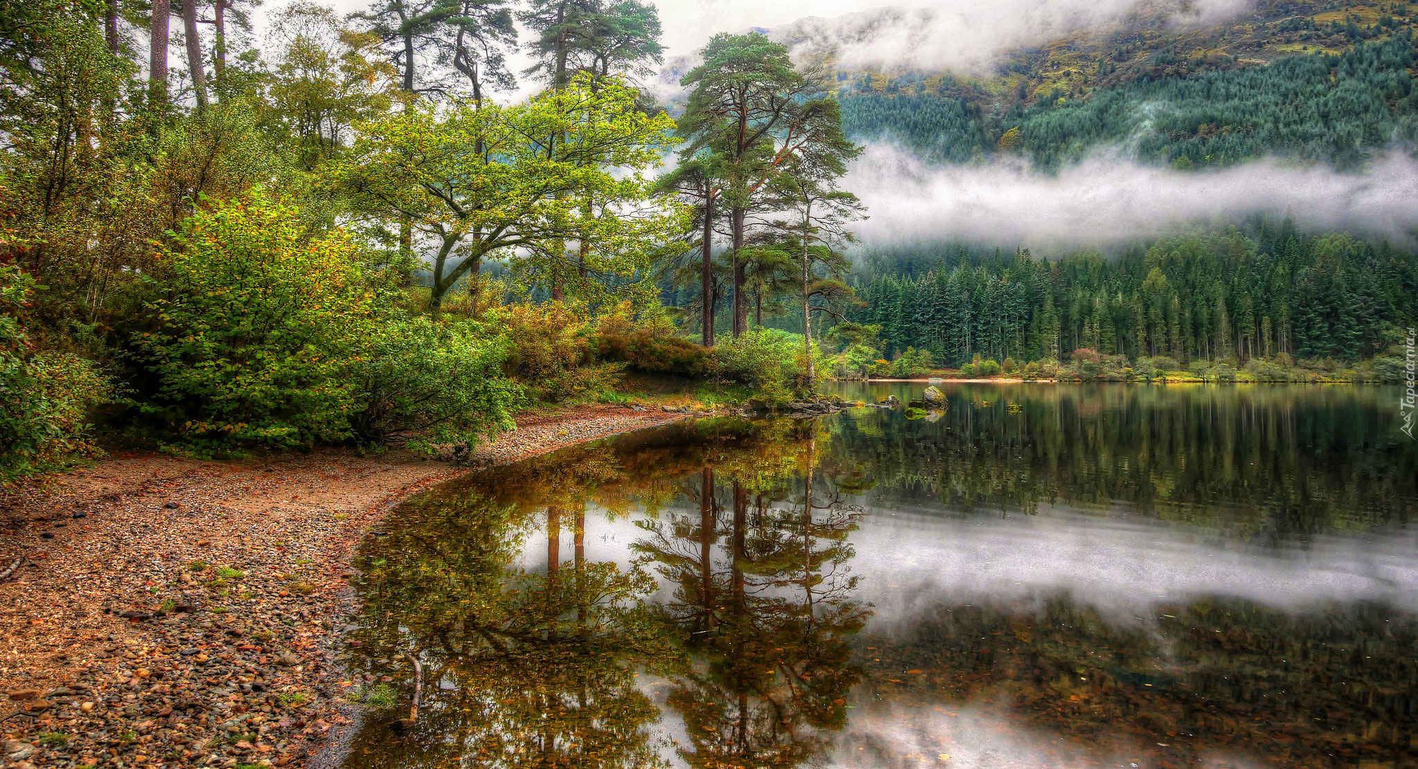 Edytor tapety: Jezioro Loch Eck i mgła nad lasem