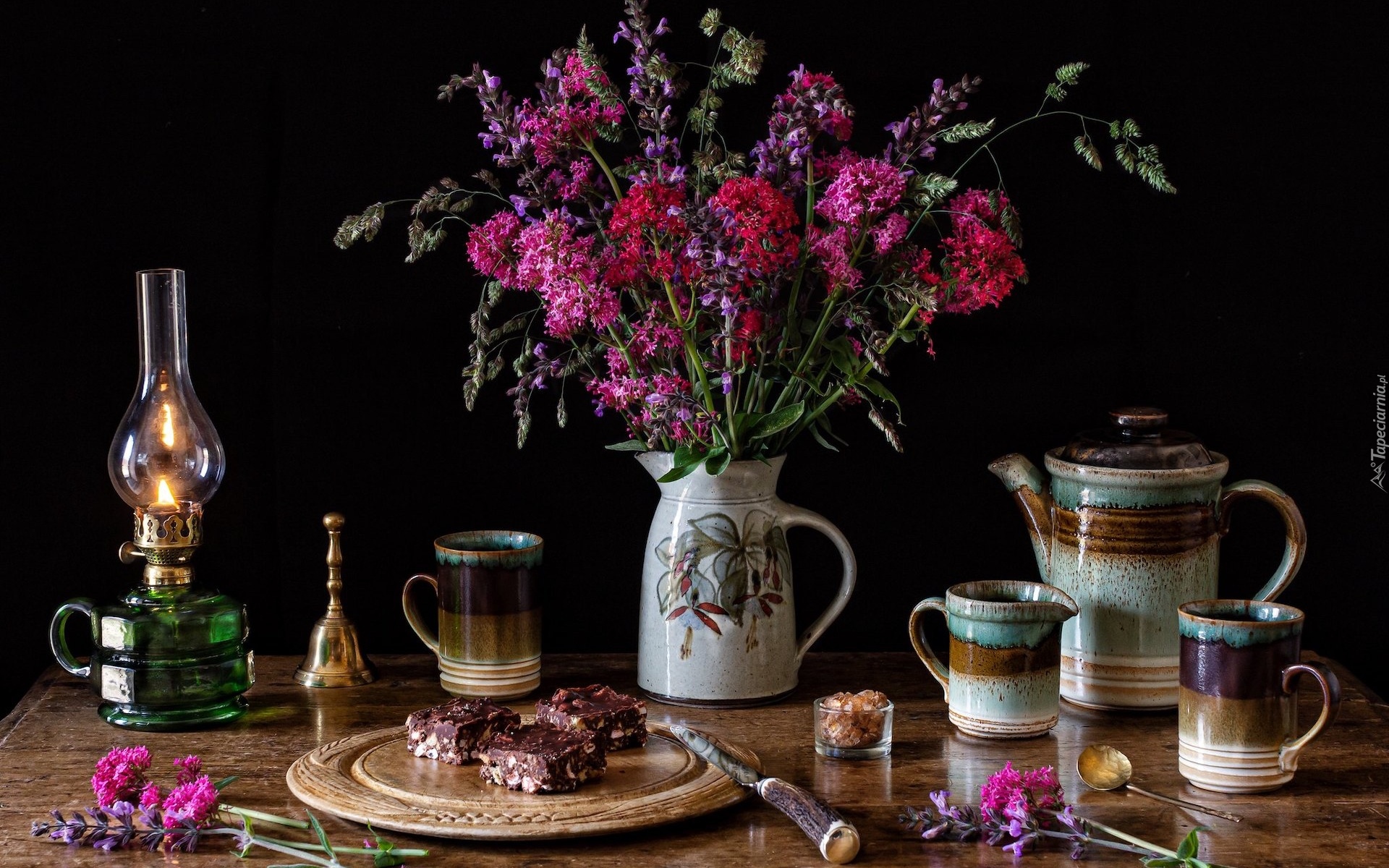 Edytor tapety: Kwiaty w dzbanku obok lampy i kawałków ciasta