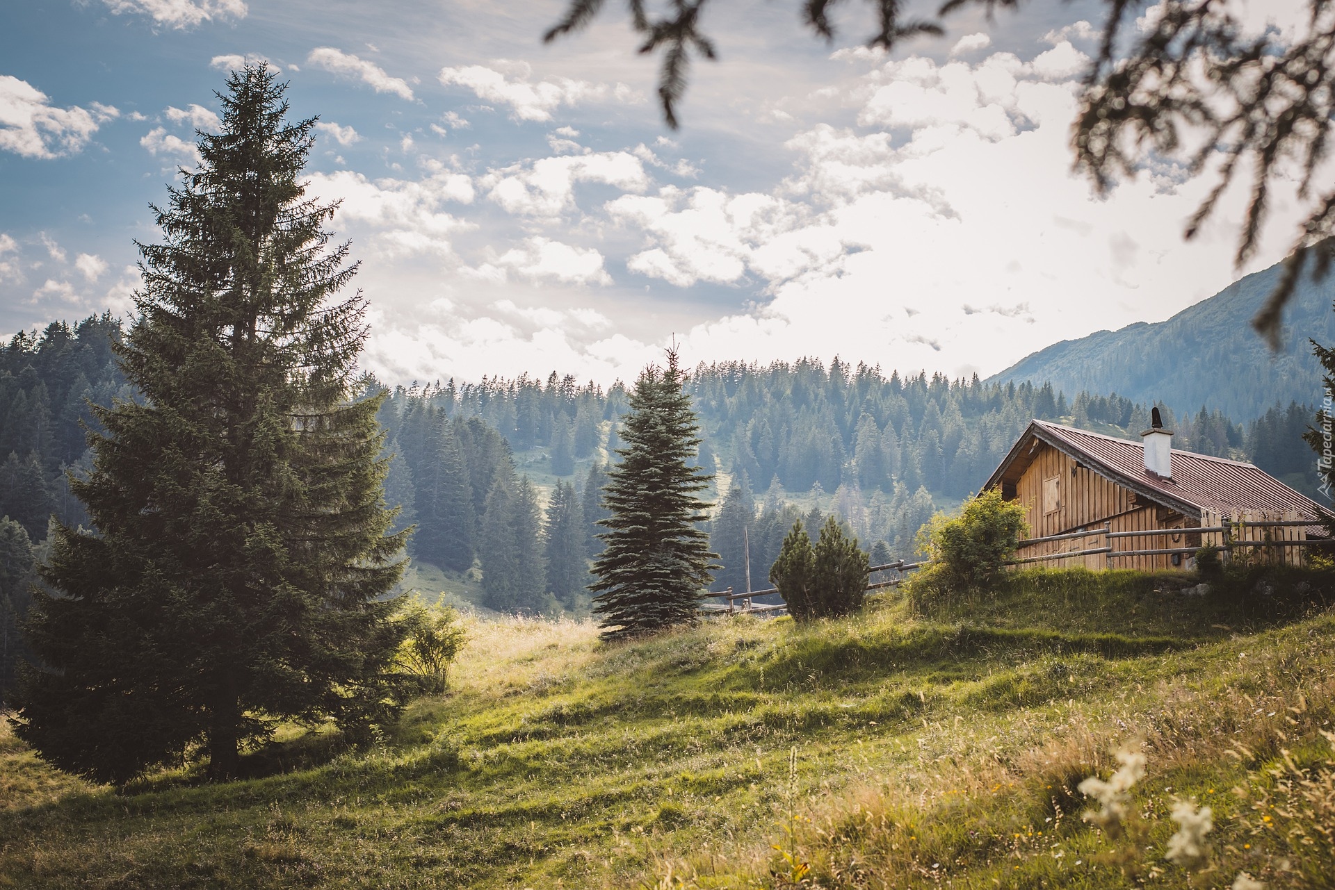 Edytor tapety: Ogrodzenie przy domu na łące pod lasem