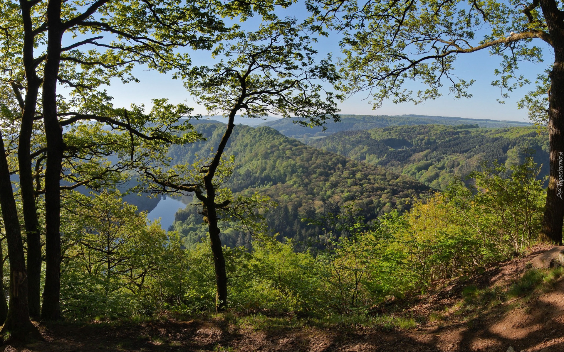 Edytor tapety: Widok zza drzew na wzgórzu na rzekę