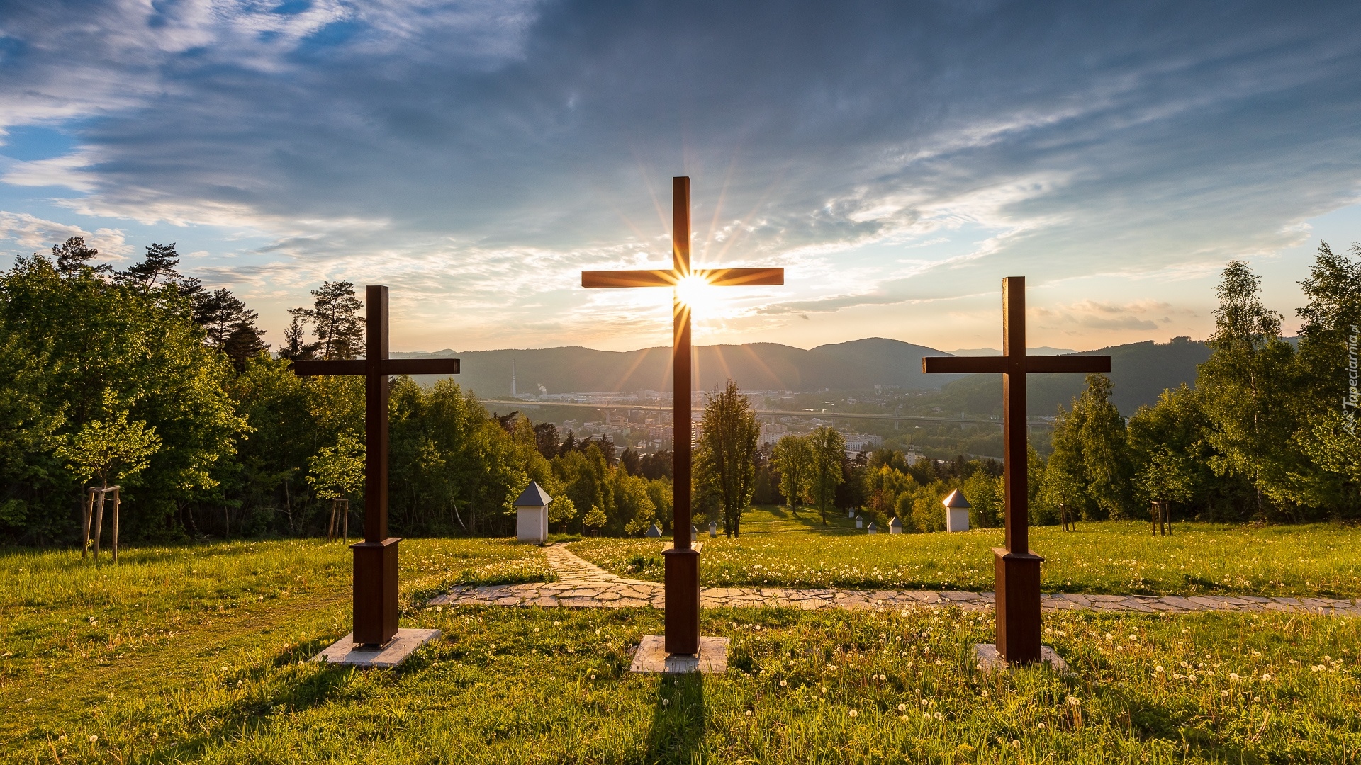 Edytor tapety: Drewniane krzyże na łące w Powaskiej Bystrzycy