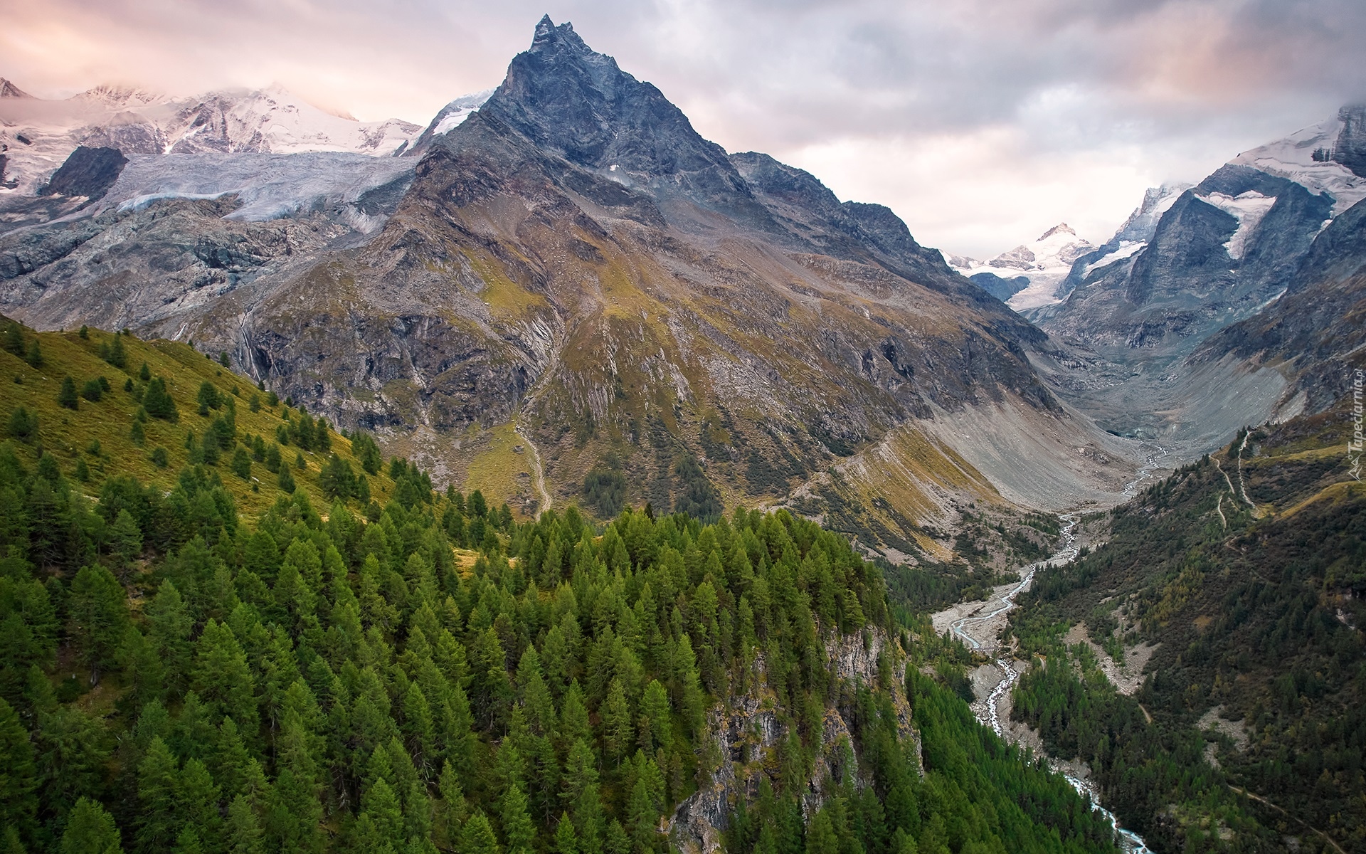 Edytor tapety: Rzeka pomiędzy zalesionymi górami w Szwajcarii