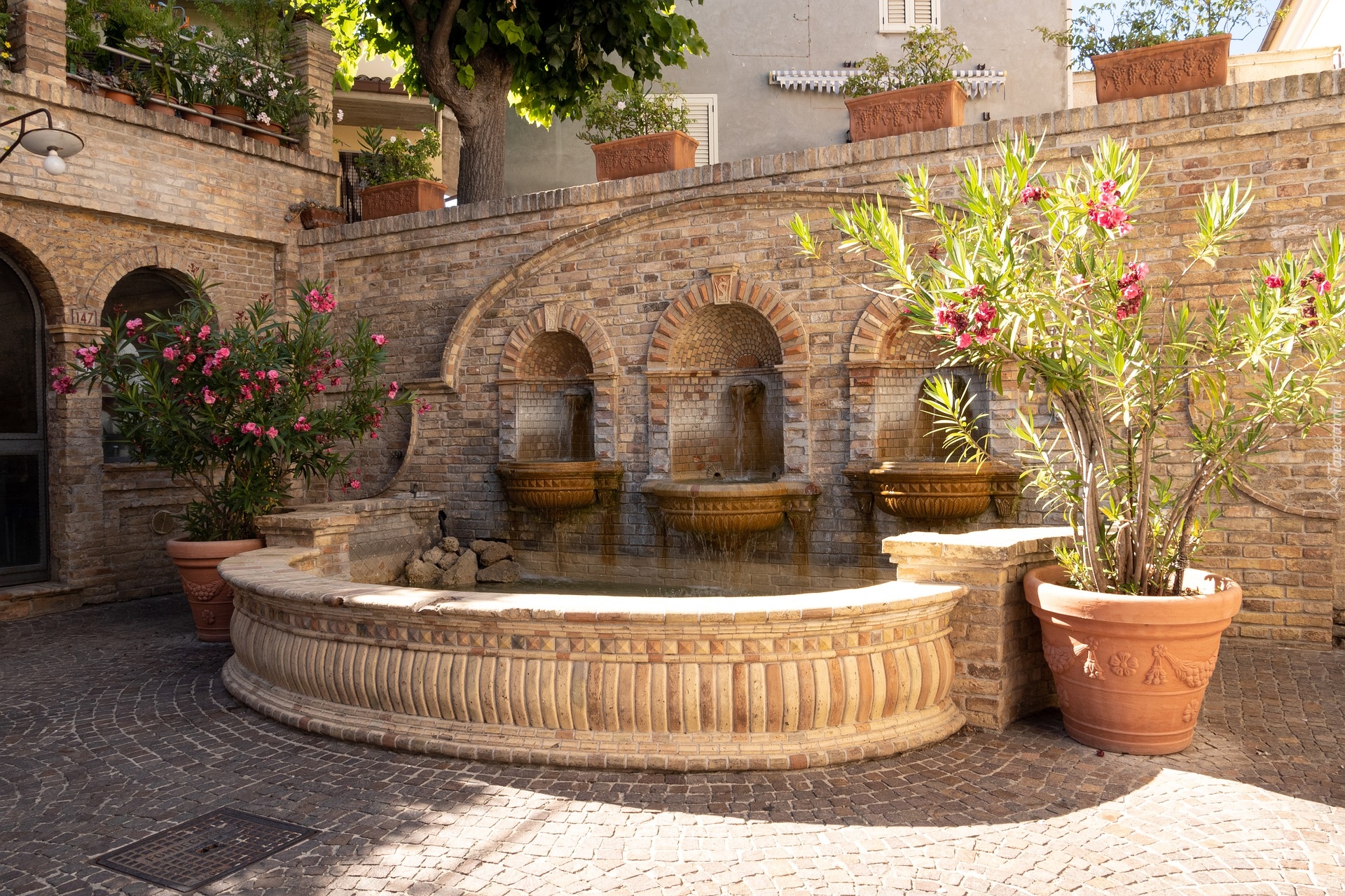 Edytor tapety: Kwiaty w donicach przy fontannie na dziedzińcu domu