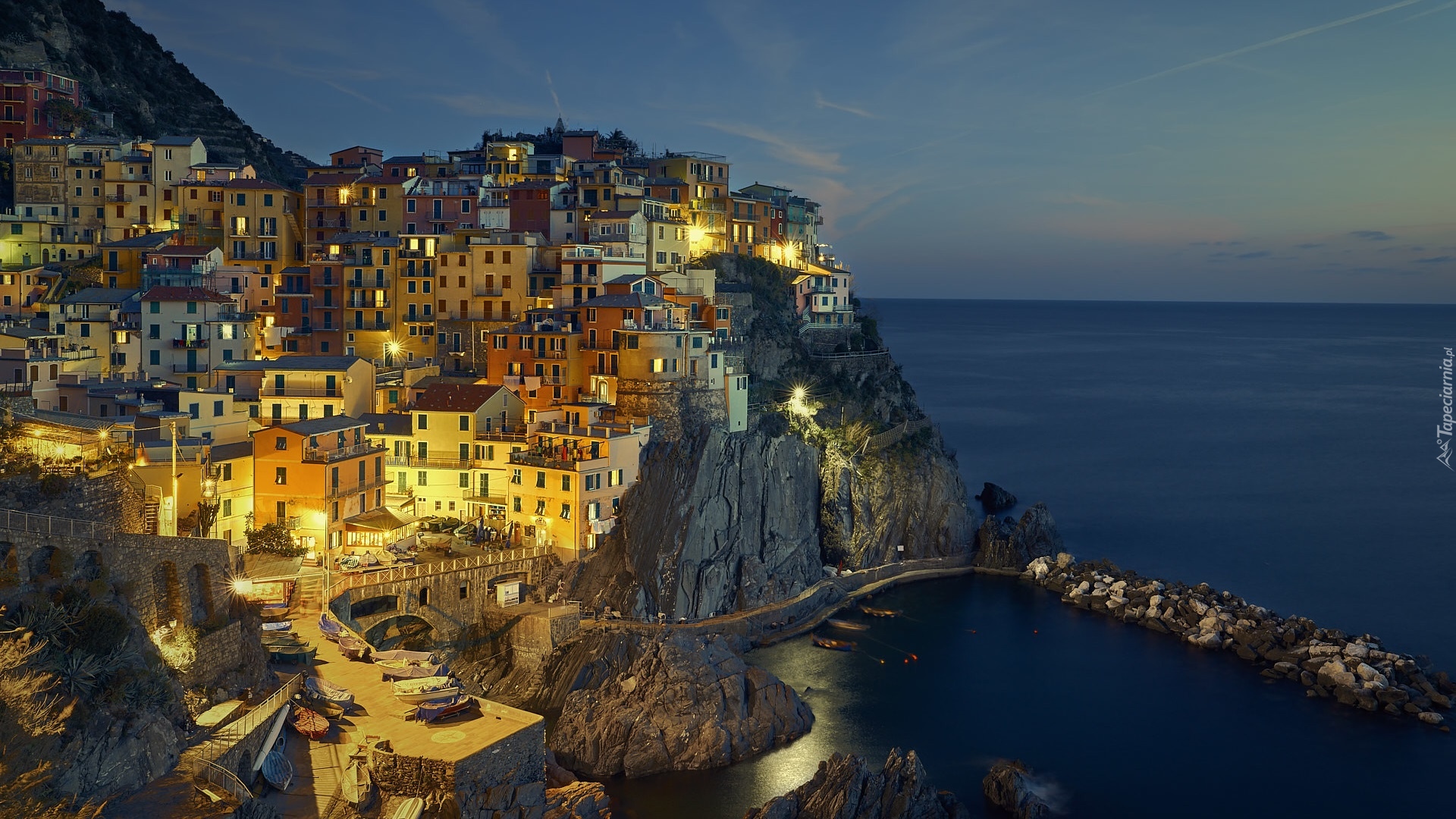 Edytor tapety: Kolorowe i oświetlone domy na skale w Manaroli