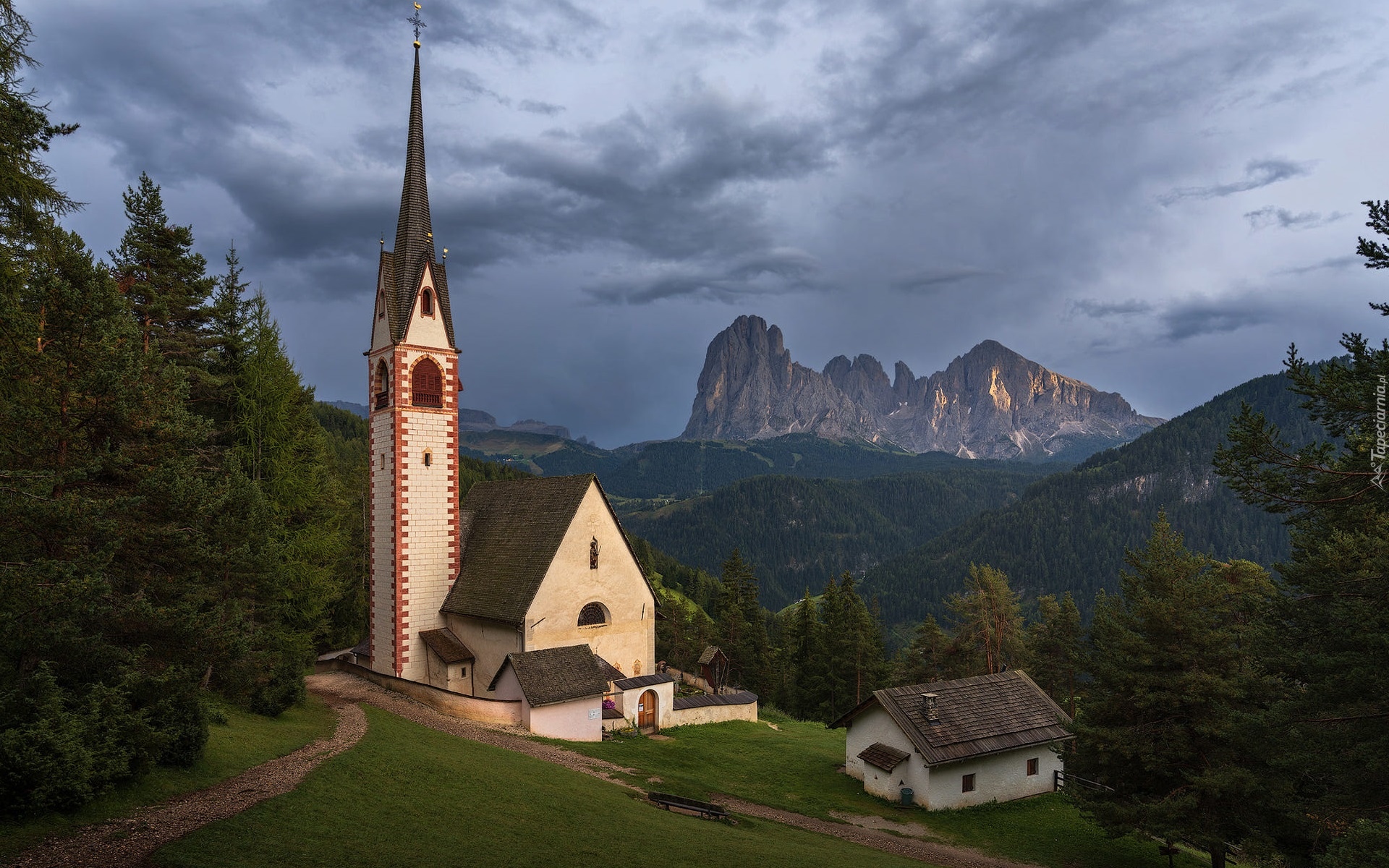 Edytor tapety: Kościół św Jakuba na tle Dolomitów