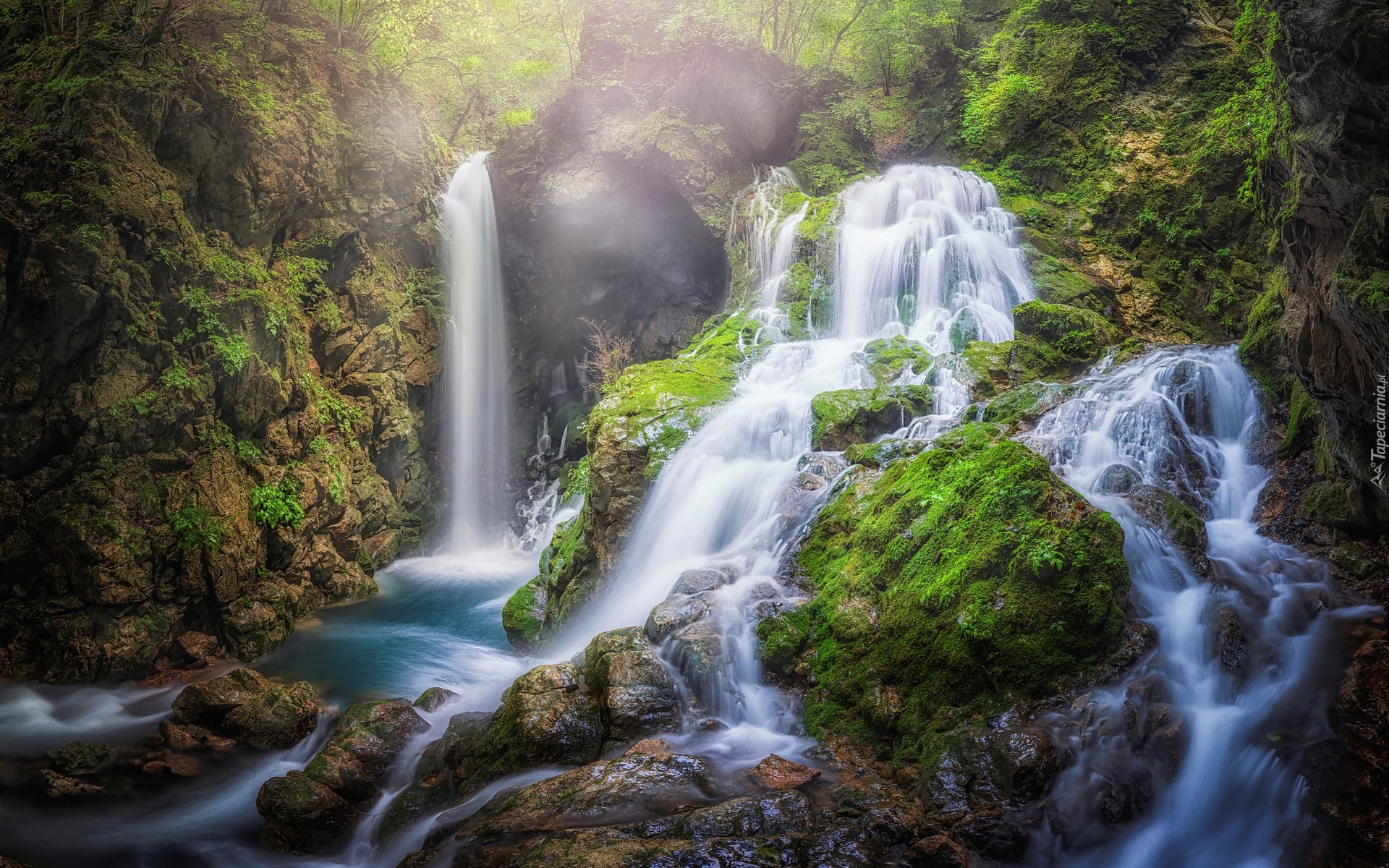 Edytor tapety: Wodospad spływający po omszałych skałach do rzeki