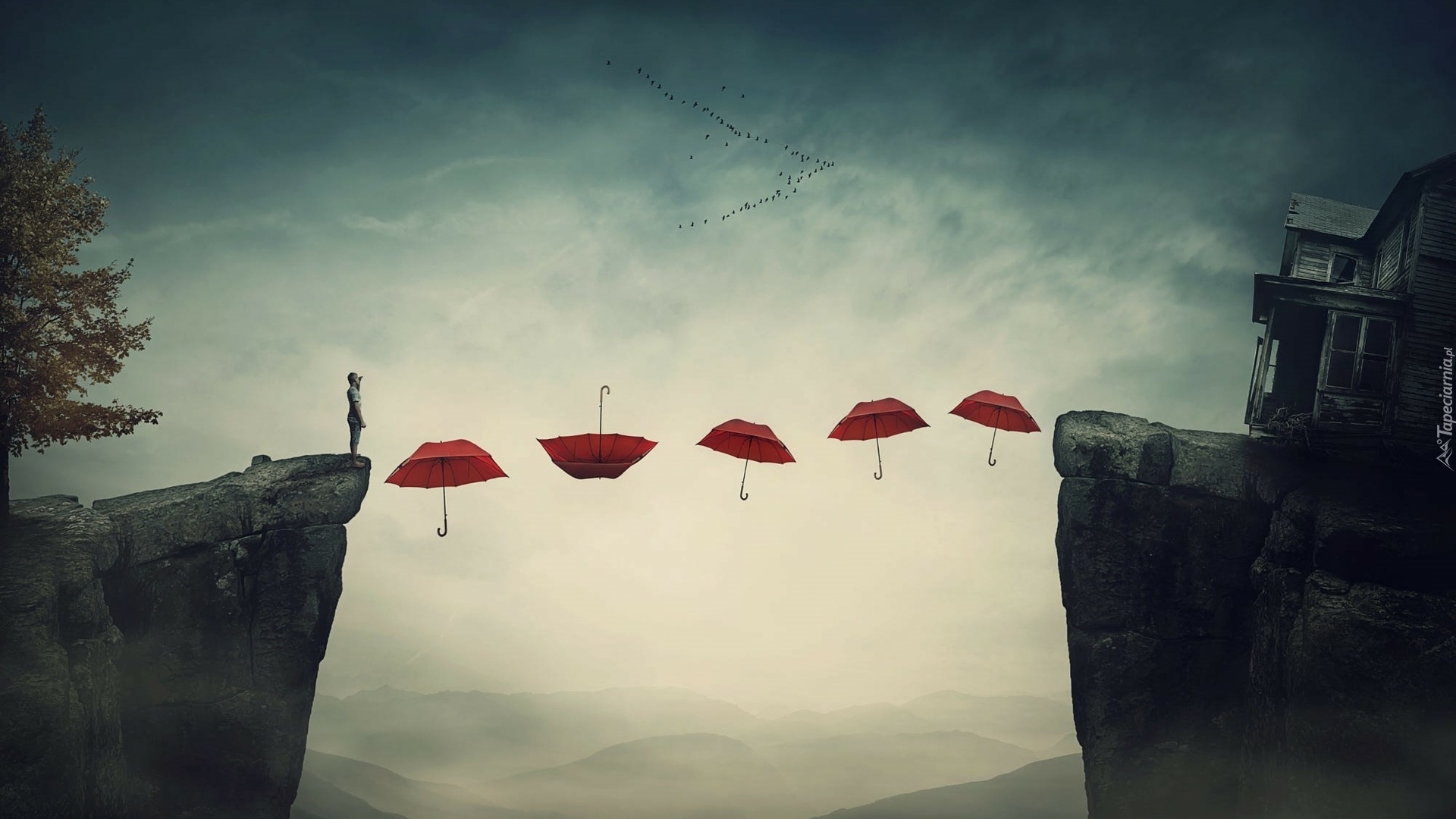 Edytor tapety: Parasolki nad przepaścią między skałami
