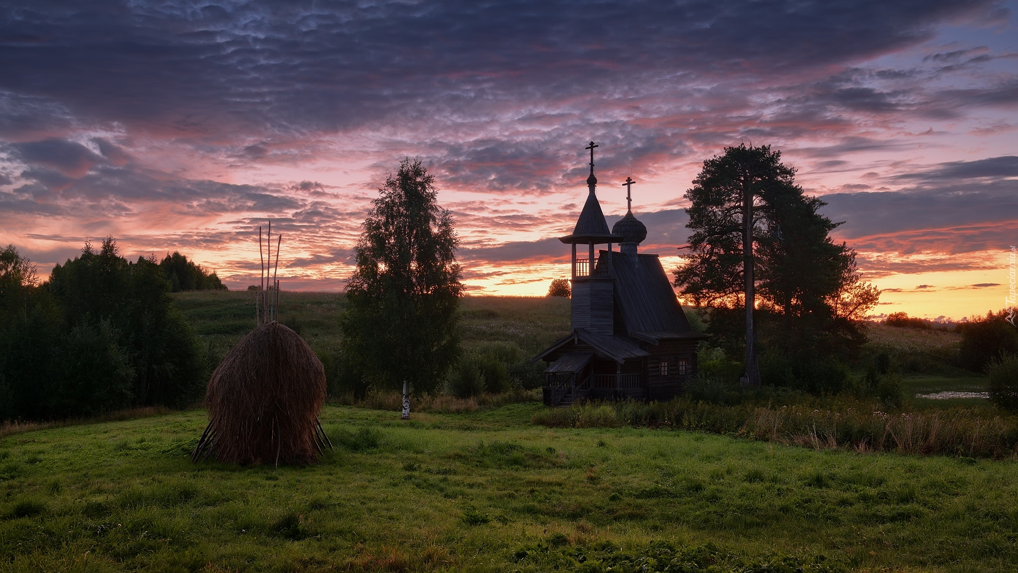 Edytor tapety: Cerkiew na łące pod zachmurzonym niebem