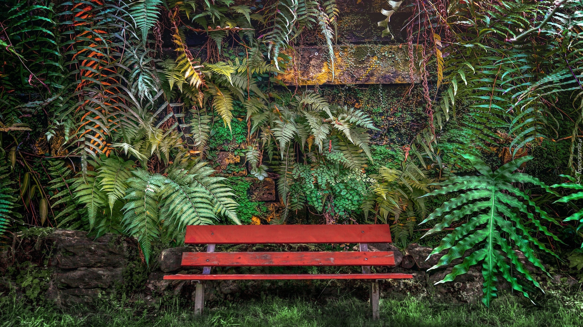 Edytor tapety: Czerwona ławka wśród zielonych paproci