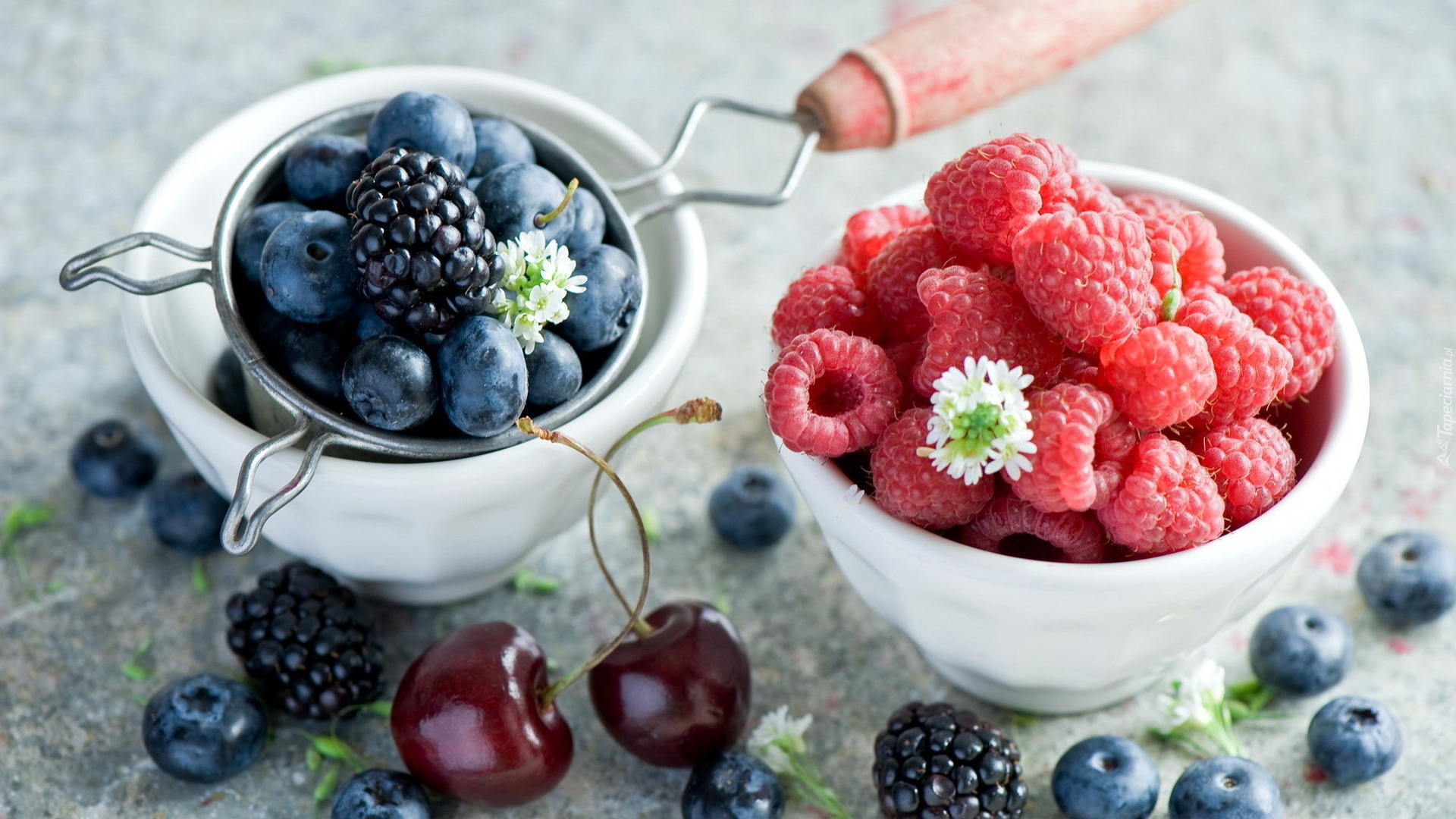 Edytor tapety: Maliny i czarne jagody w miseczkach