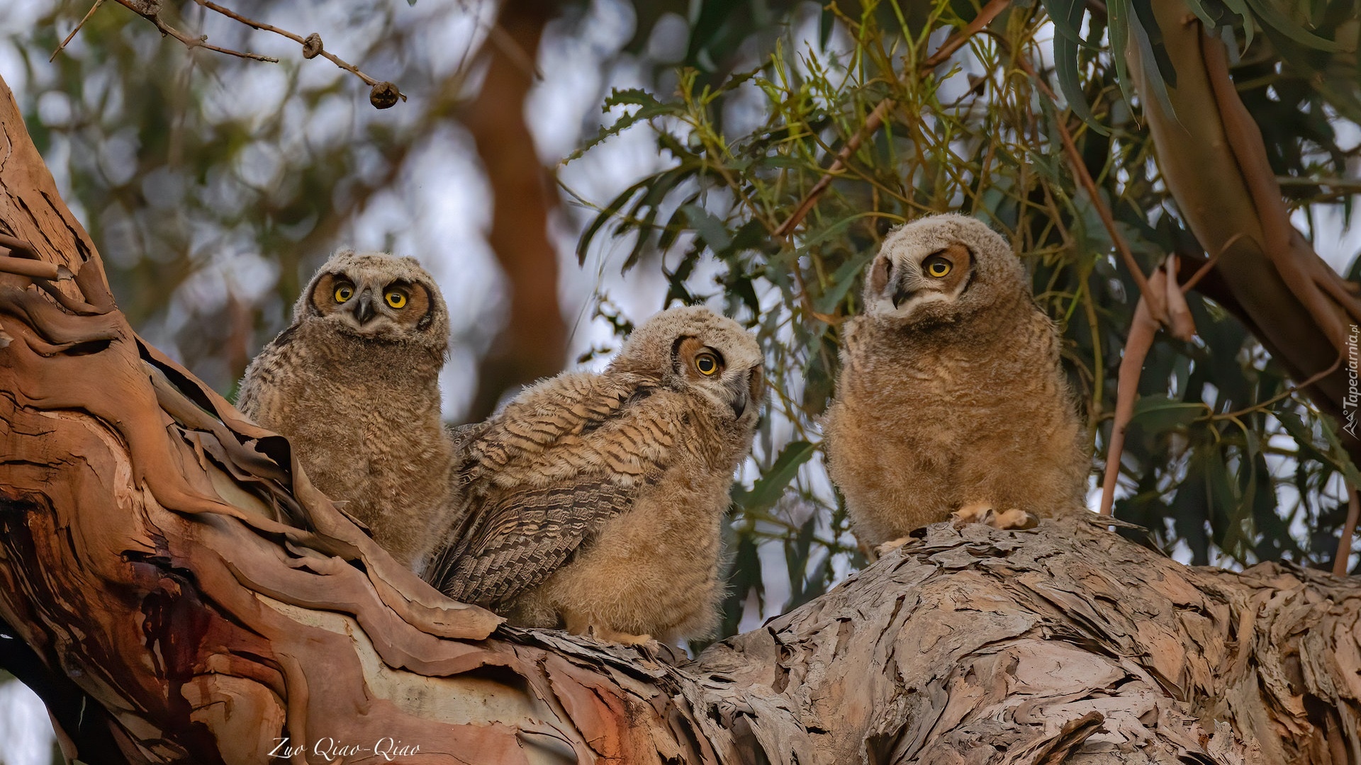 Edytor tapety: Trzy puchacze wirginijskie na drzewie
