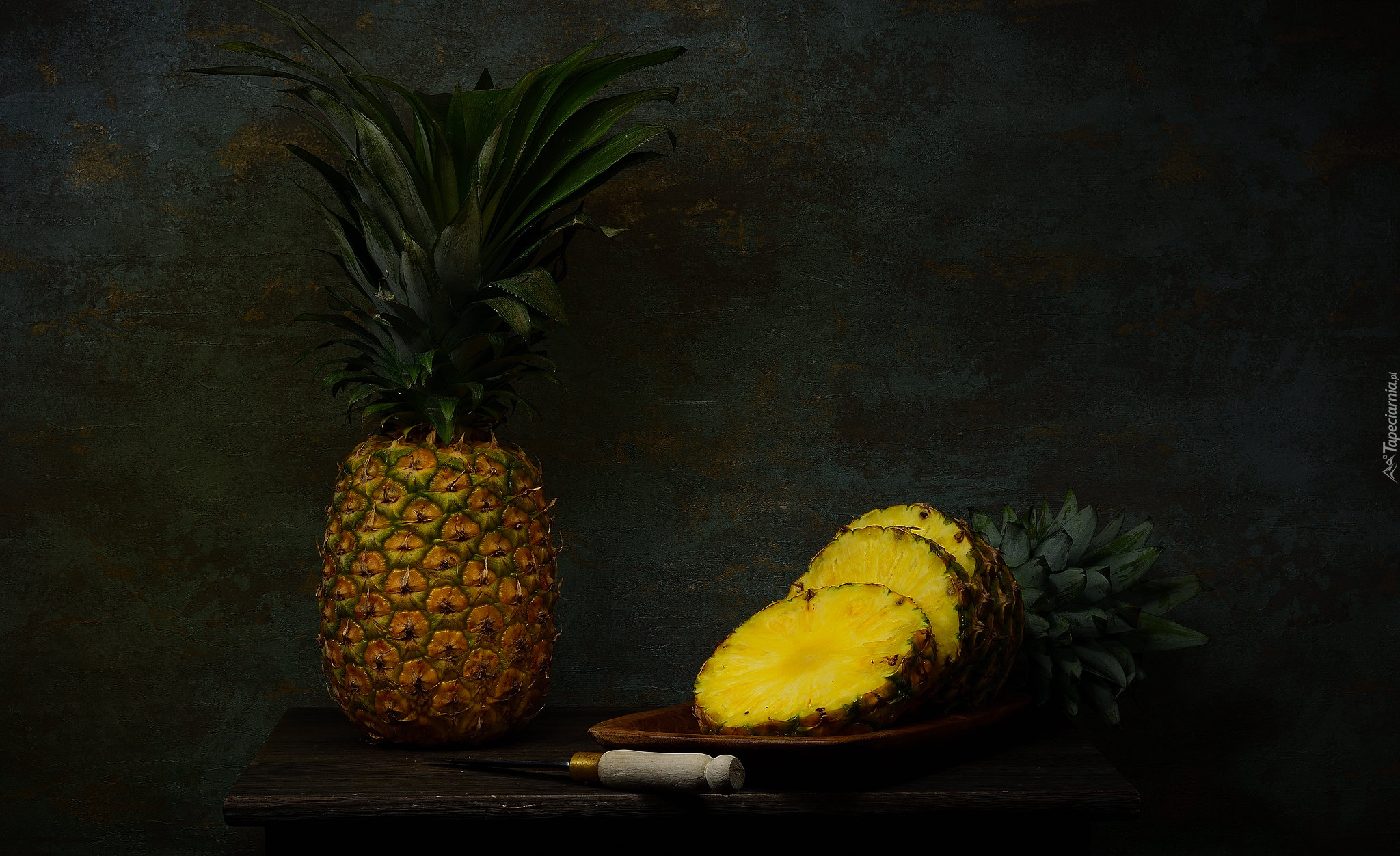 Edytor tapety: Plastry ananasa obok noża na komodzie
