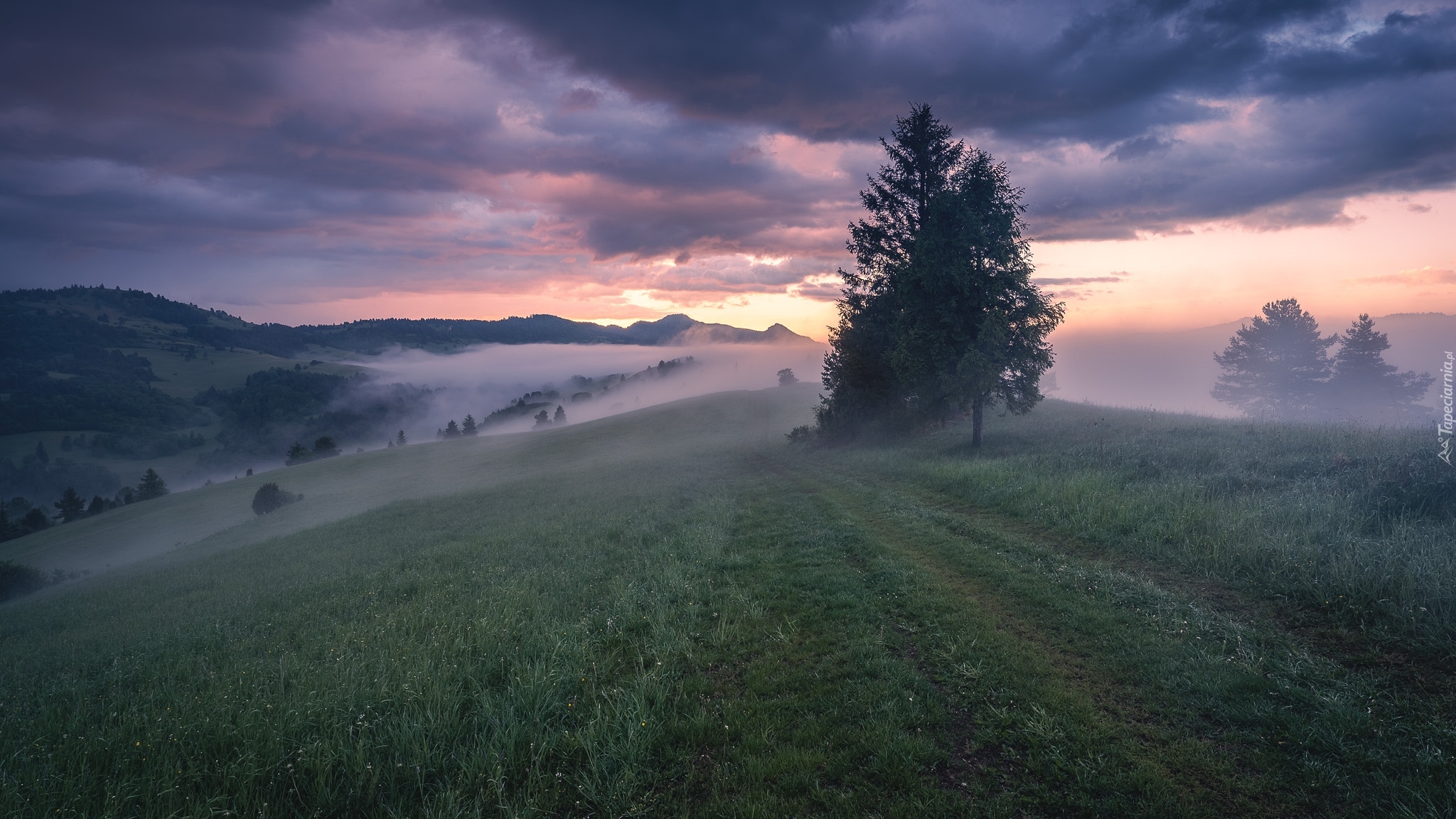 Edytor tapety: Drzewa na polanie w zamglonych Małych Pieninach