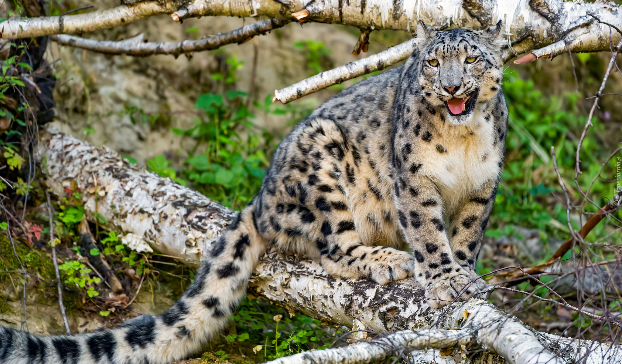 Edytor tapety: Irbis na powalonym konarze drzewa