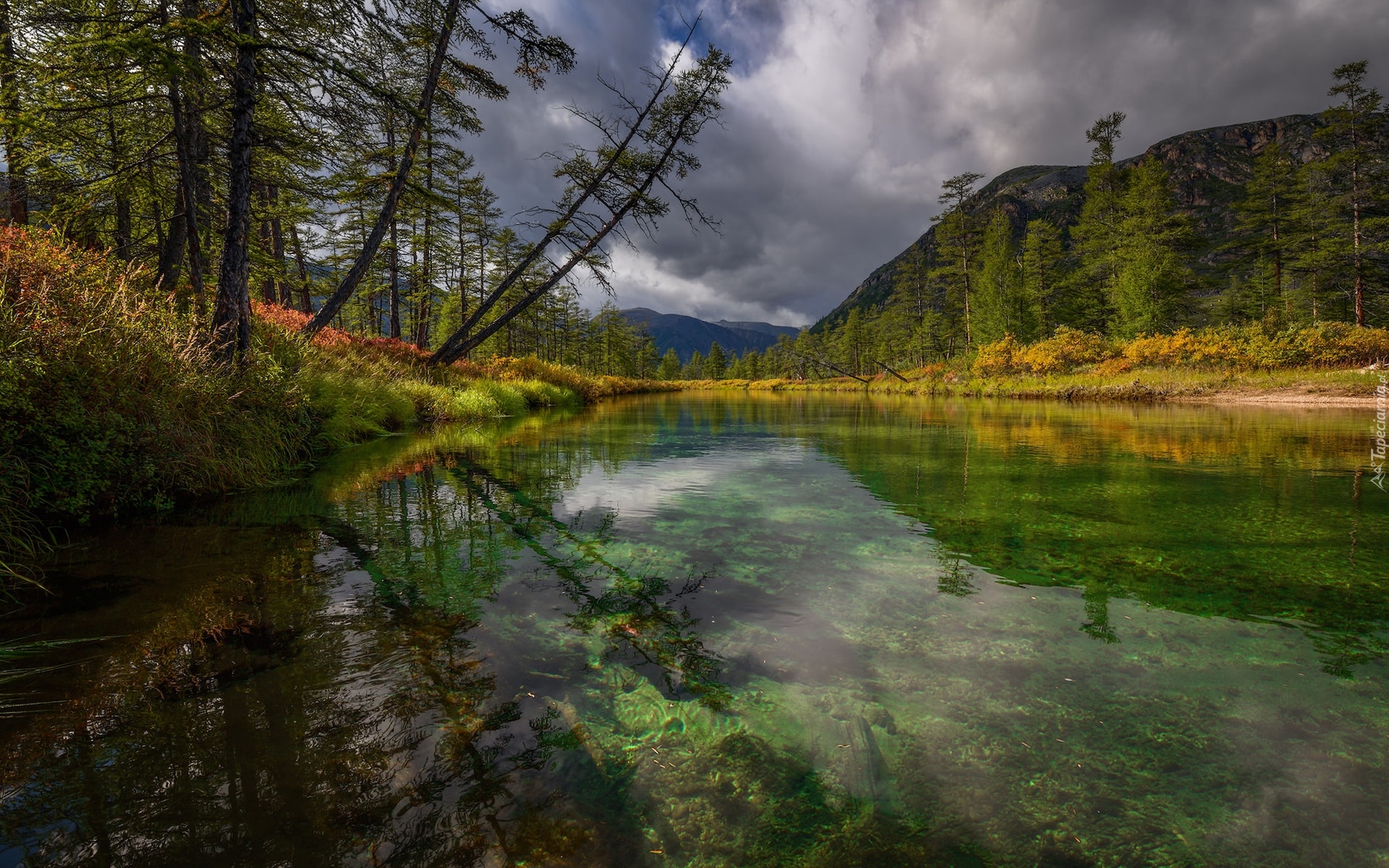 Edytor tapety: Ciemne chmury nad górami i jeziorem Jack London