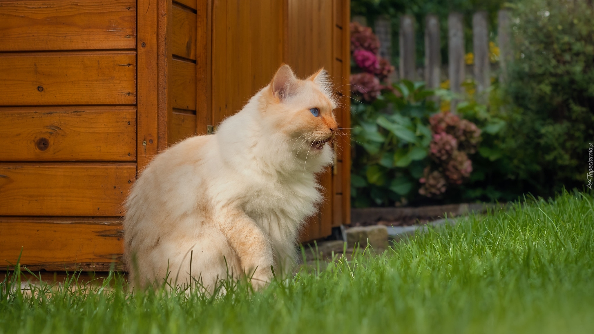 Edytor tapety: Kot na trawie obok altanki w ogrodzie