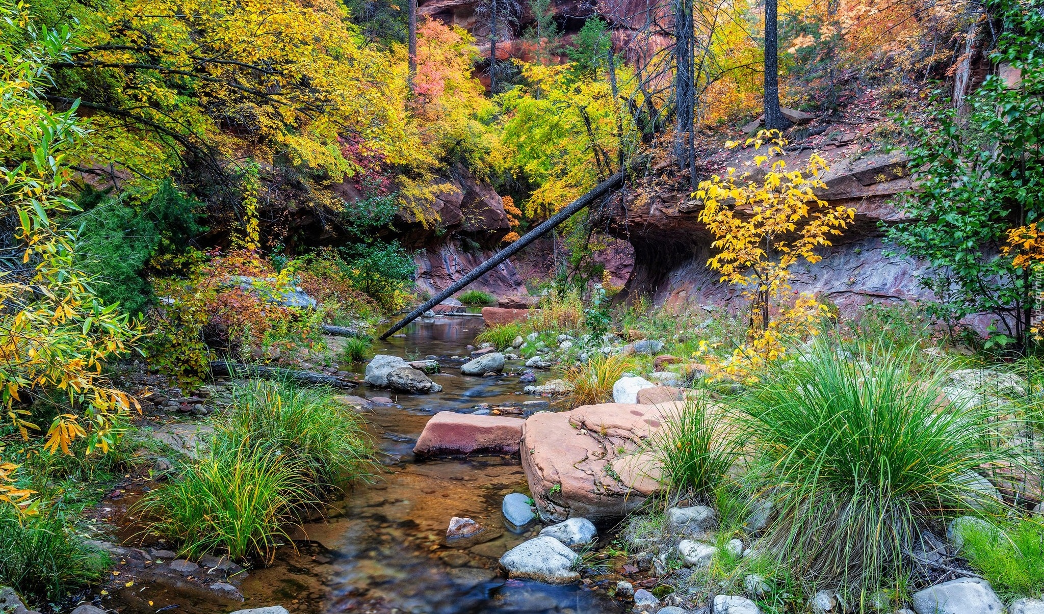Edytor tapety: Drzewa i rośliny na skałach nad rzeką