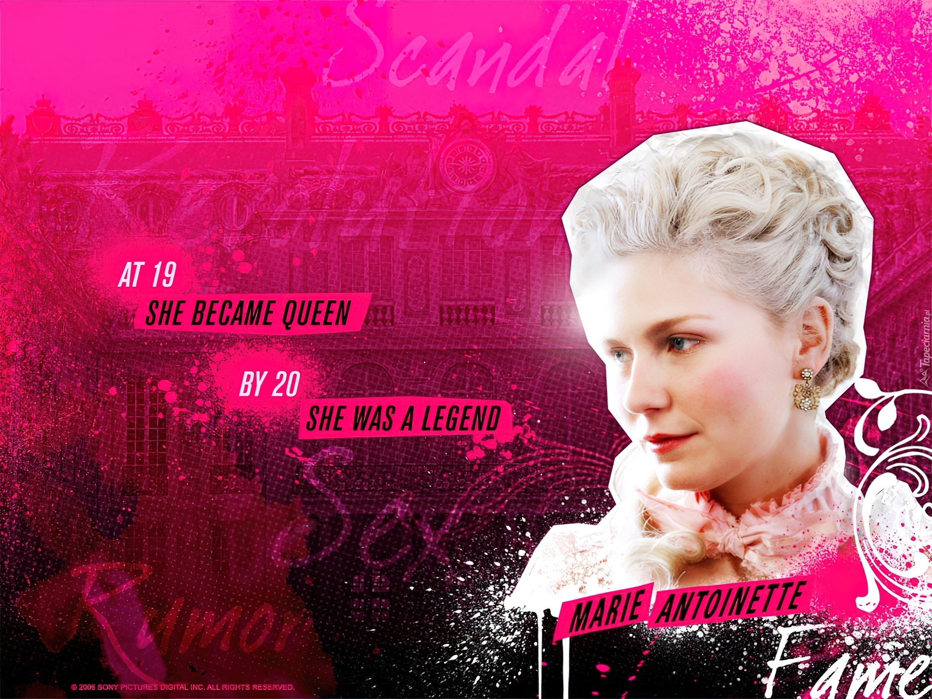 Edytor tapety: Marie Antoinette, Kirsten Dunst, fryzura, różowe, tło