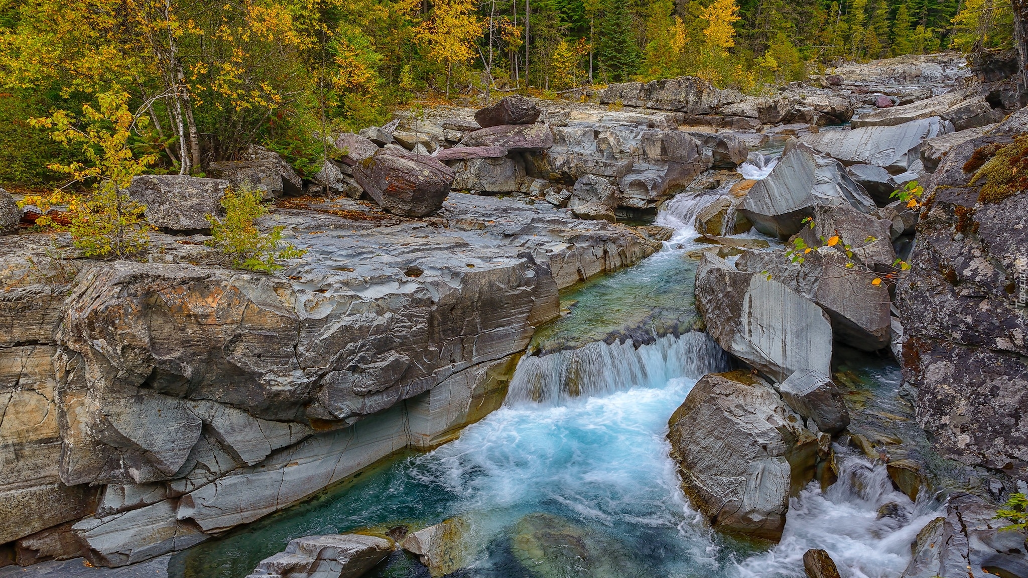 Edytor tapety: Jesienne drzewa i kamienie nad potokiem