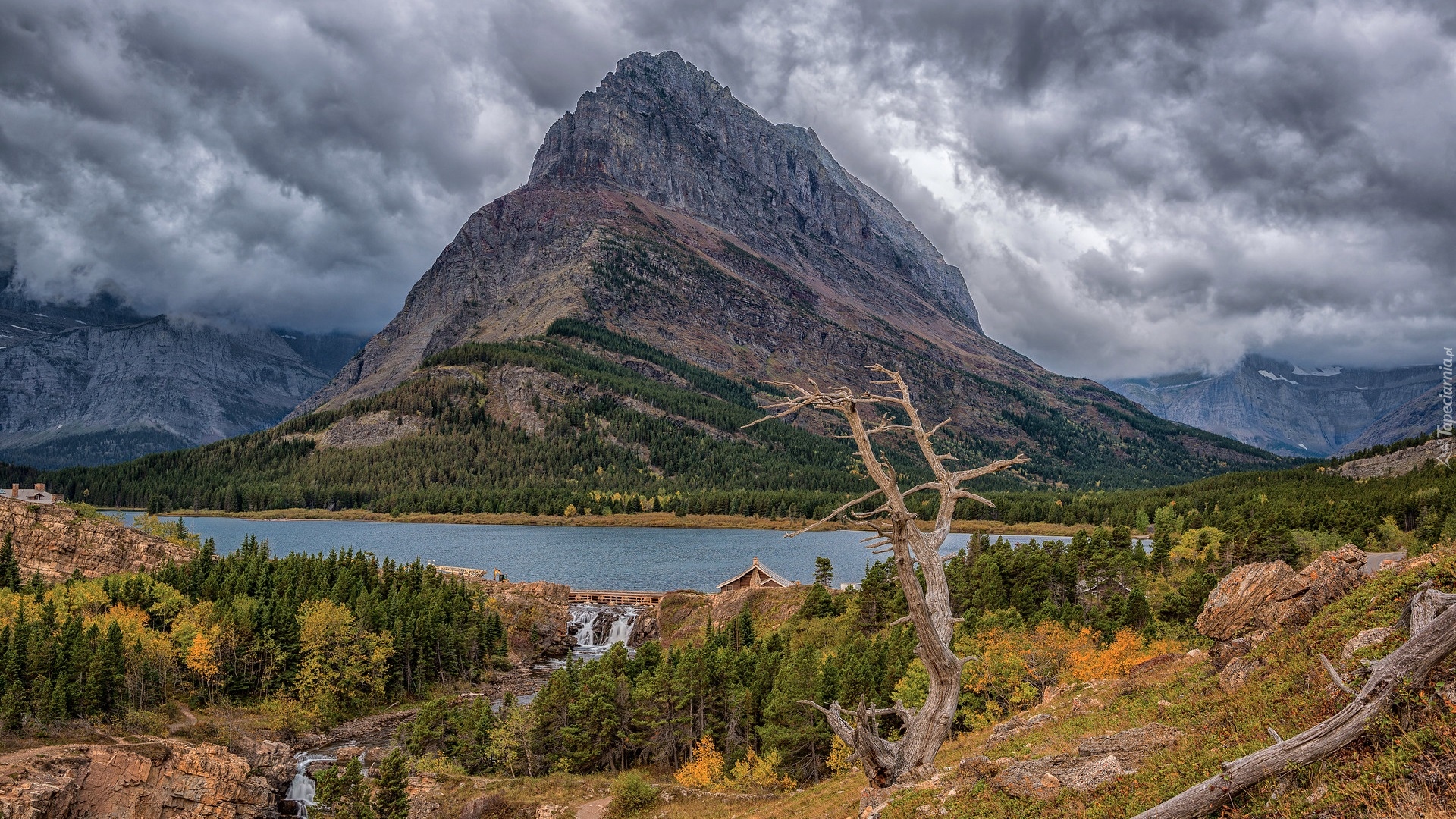 Edytor tapety: Suche drzewo nad jeziorem Swiftcurrent Lake