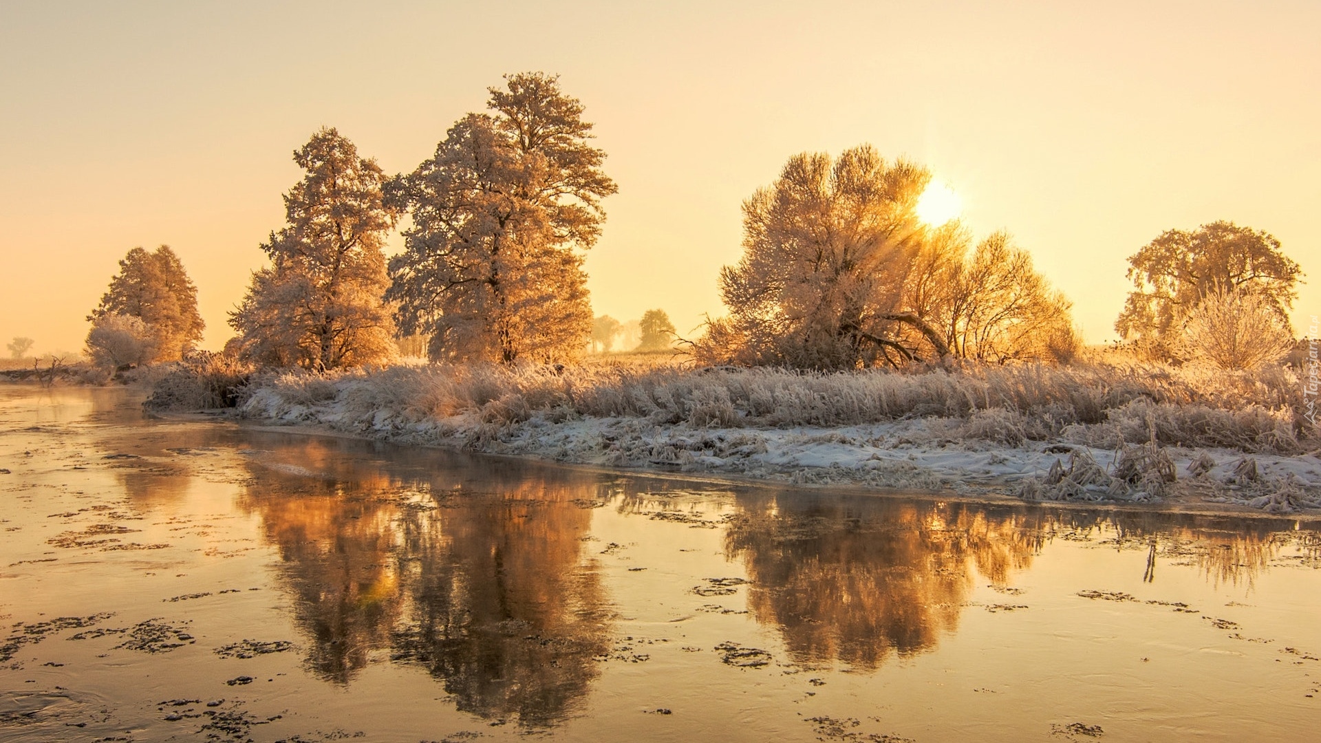 Edytor tapety: Oszronione drzewa nad rzeką Gwda