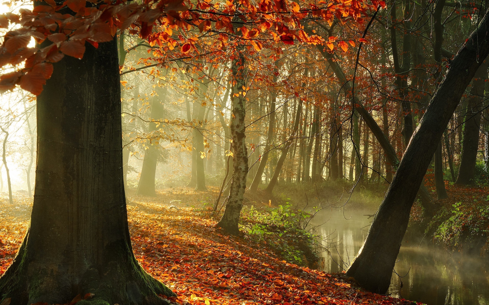 Edytor tapety: Rzeka i opadłe liście w jesiennym lesie