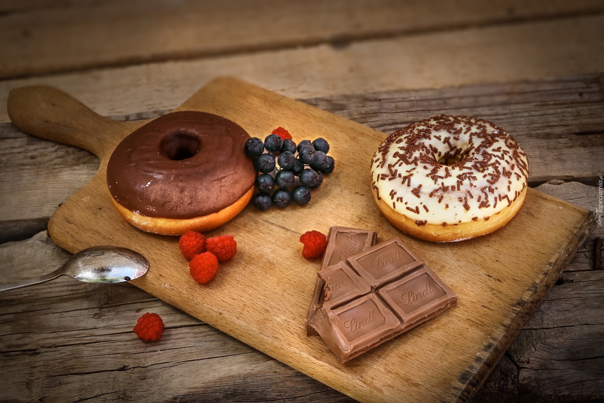 Edytor tapety: Donuty i kawałki czekolady na desce