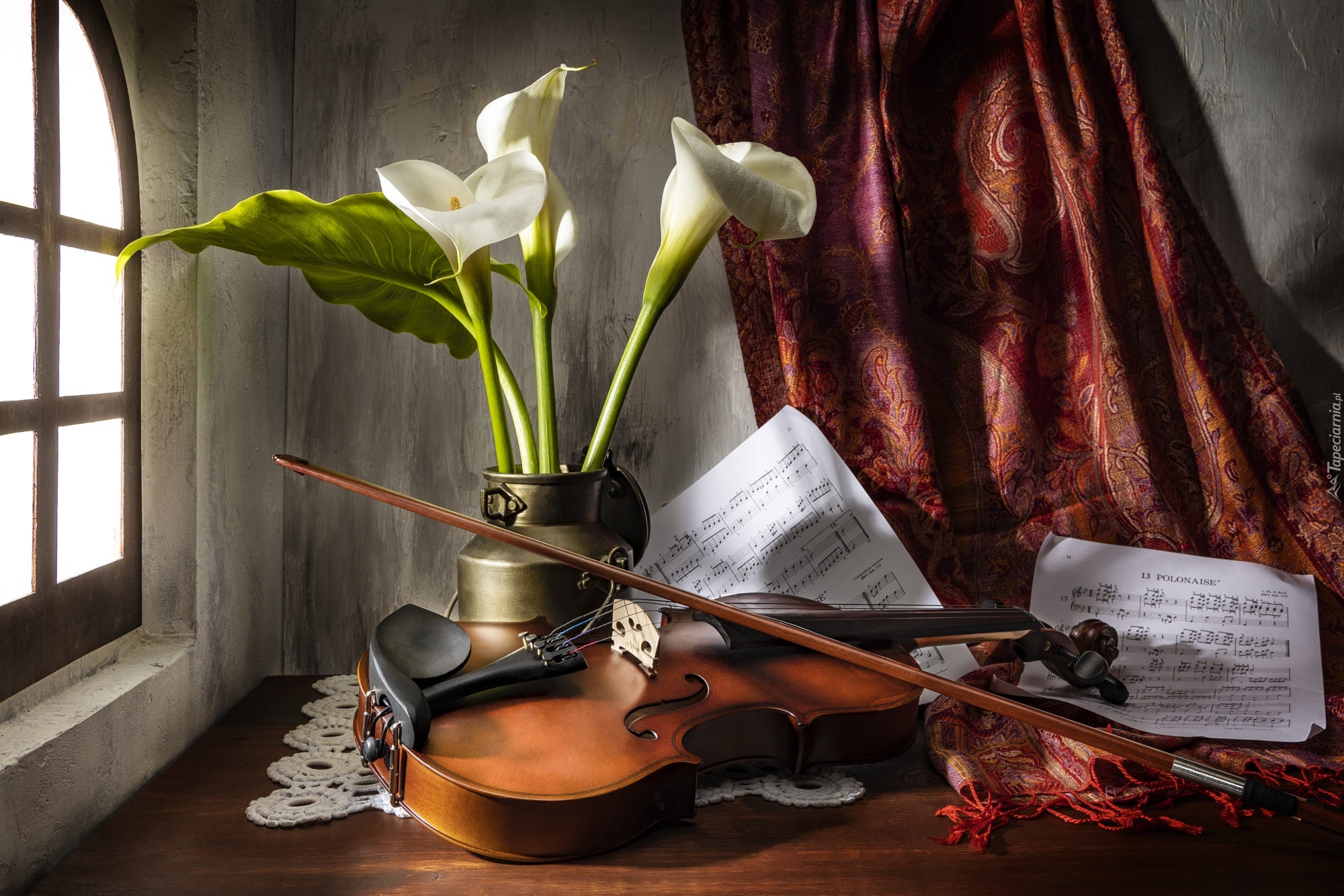 Edytor tapety: Białe kalie w dzbanku obok skrzypiec i nut
