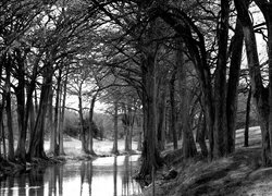 Edytor tapety: Bezlistne drzewa nad rzeką w parku