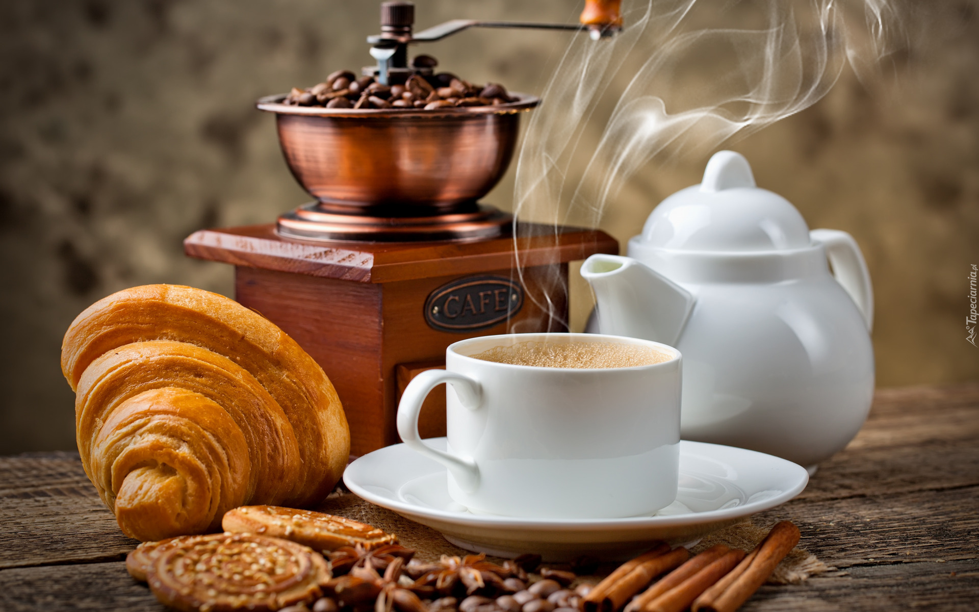 Edytor tapety: Filiżanka kawy obok młynka i czajniczka