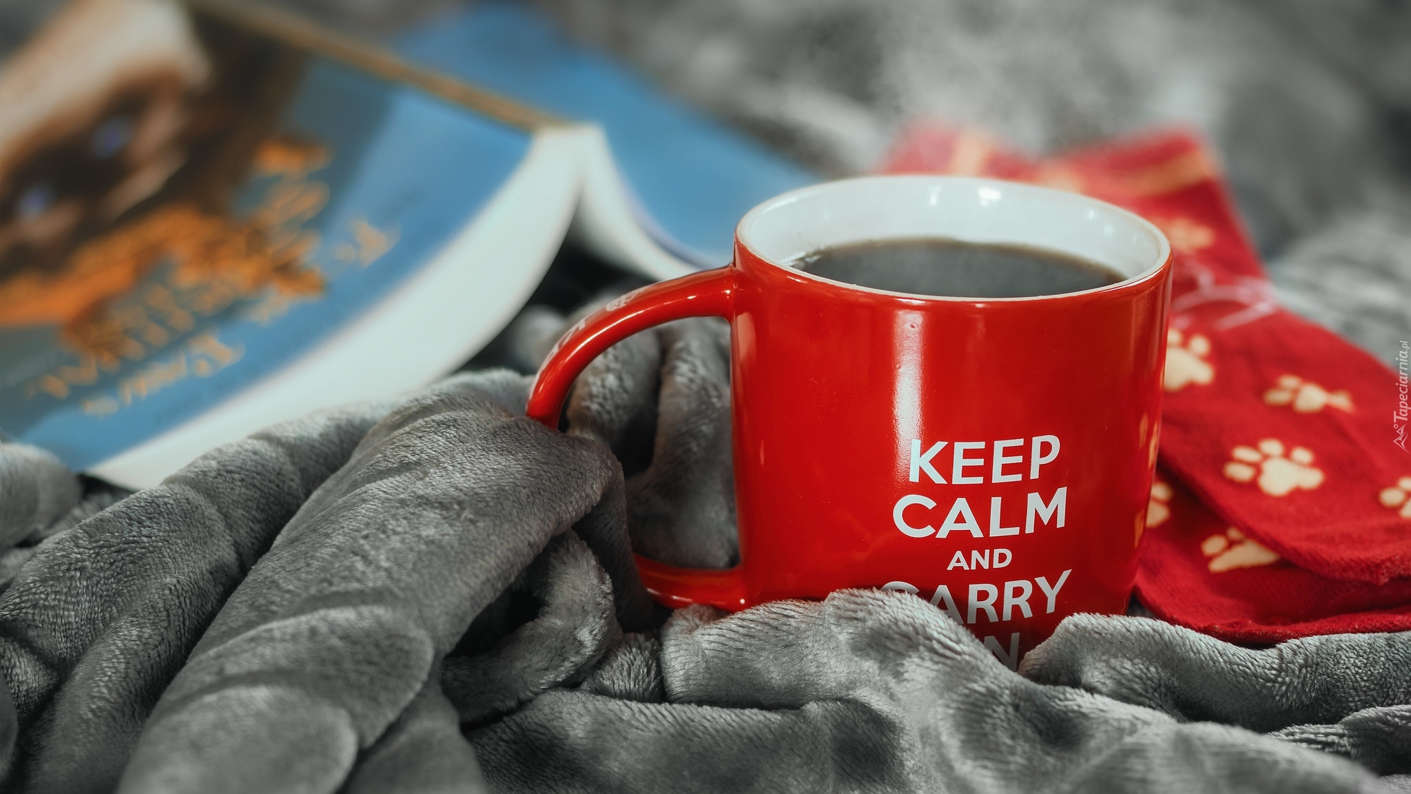 Edytor tapety: Czerwony kubek z kawą obok książki na kocu
