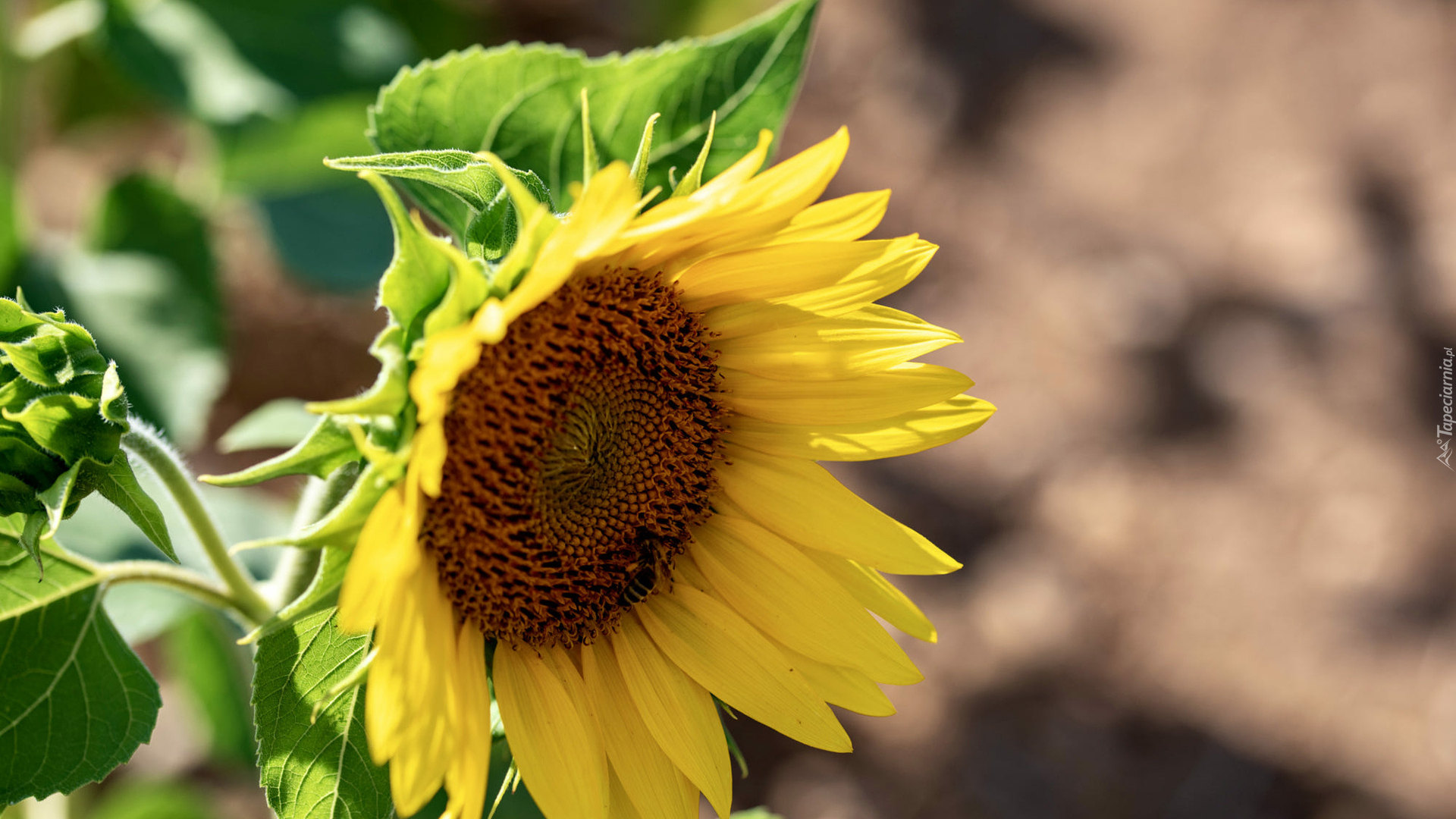 Edytor tapety: Słonecznik z zielonymi liśćmi