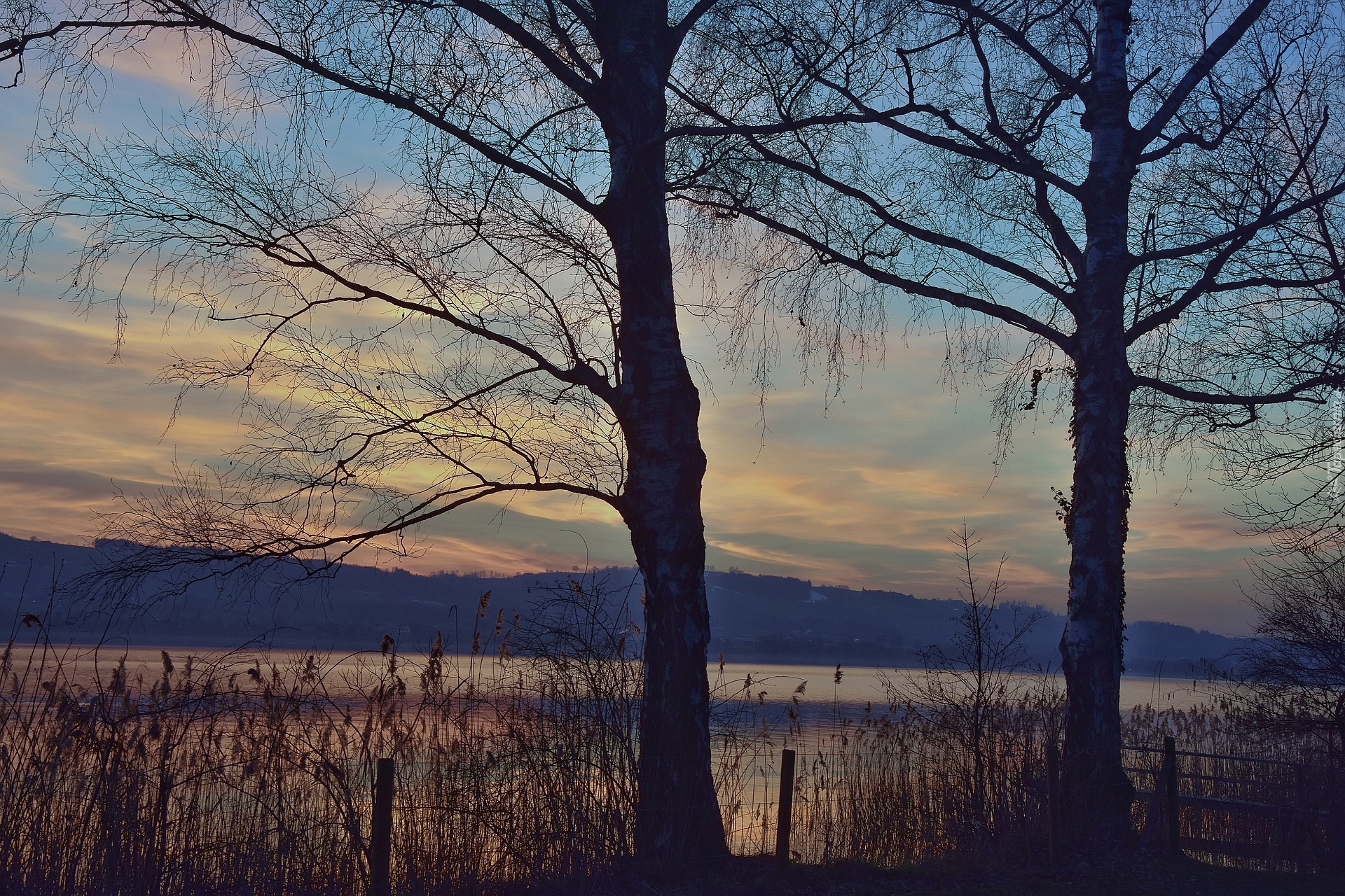 Edytor tapety: Bezlistne drzewa nad jeziorem Sempachersee