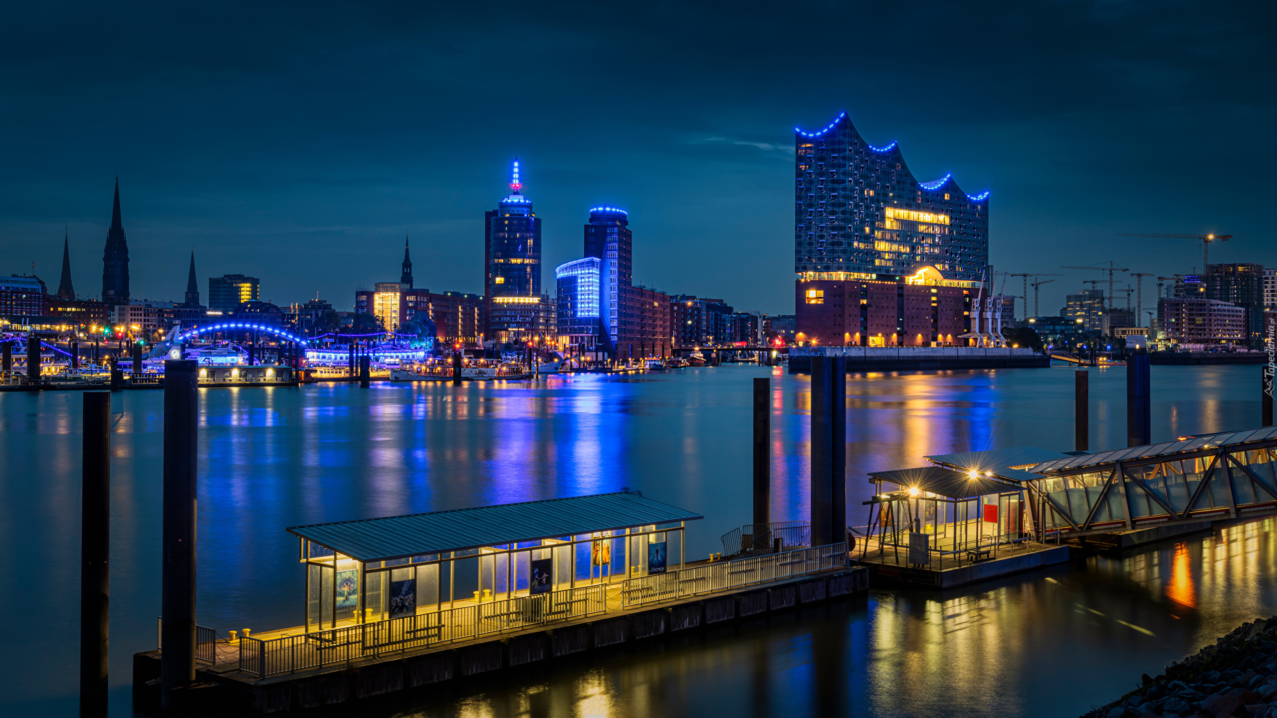 Edytor tapety: Oświetlone wieżowce w Hamburgu