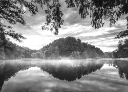 Edytor tapety: Kolorowe niebo zachodzącego słońca nad drzewami i jeziorem