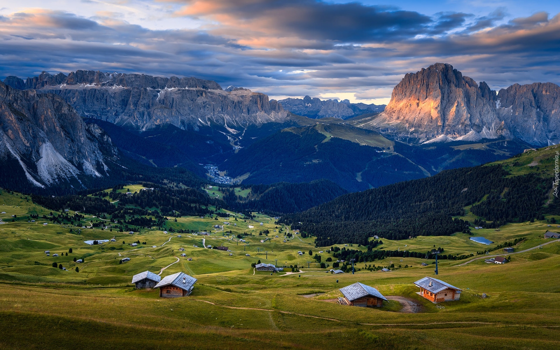 Edytor tapety: Domy w dolinie na tle gór i lasów