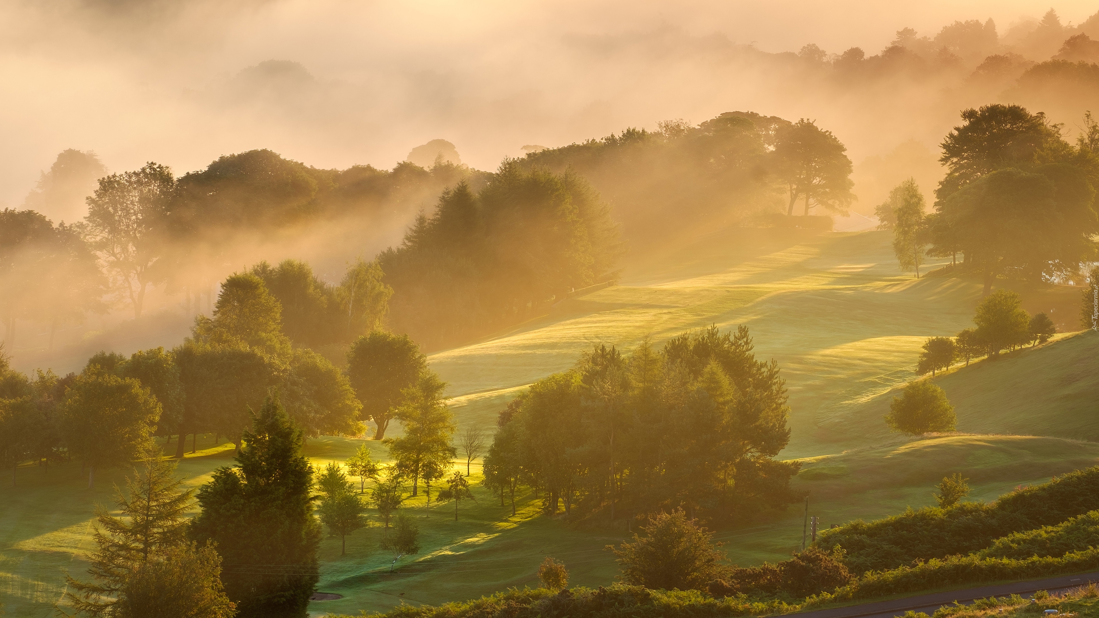 Edytor tapety: Drzewa na zamglonym wzgórzu o poranku